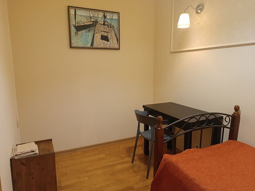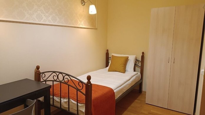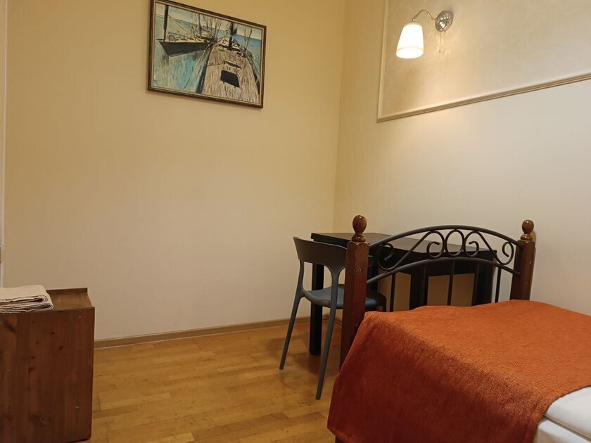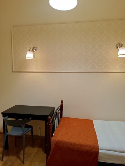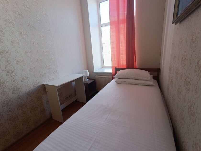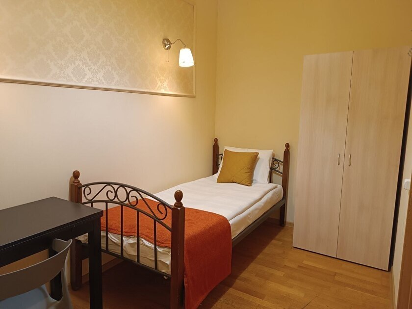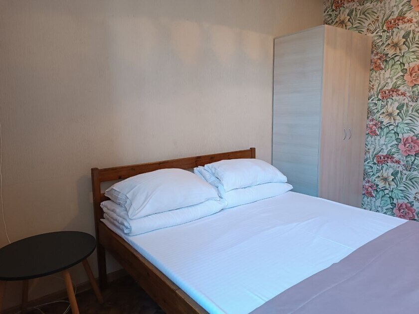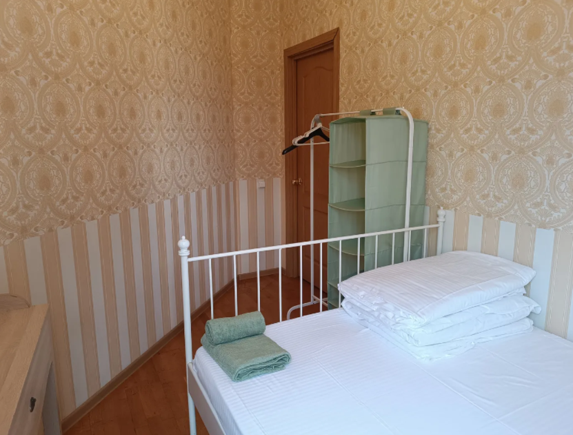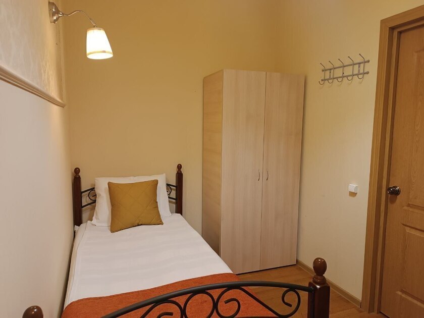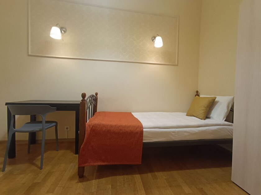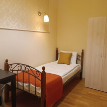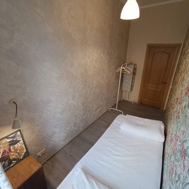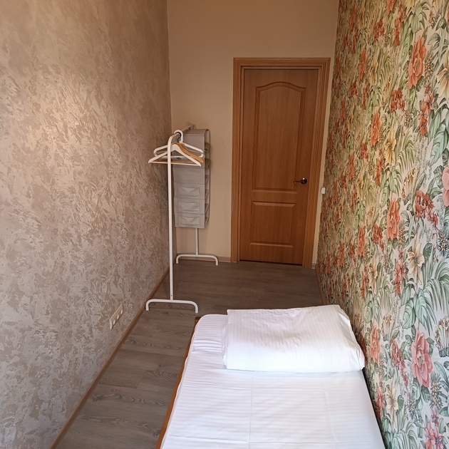 Комнаты оснащены односпальной кроватью, шкафом, тумбочка прикроватная, ночник. Для комфорта гостей есть полотенца, тапочки, постельное белье высокого качества из 100% хлопка страйп-сатин.