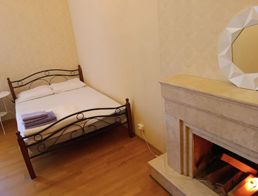 Комната оснащена двуспальной кроватью. Для хранения одежды шкаф, прикроватная тумба со светильником. Для комфорта гостей есть полотенца, тапочки.