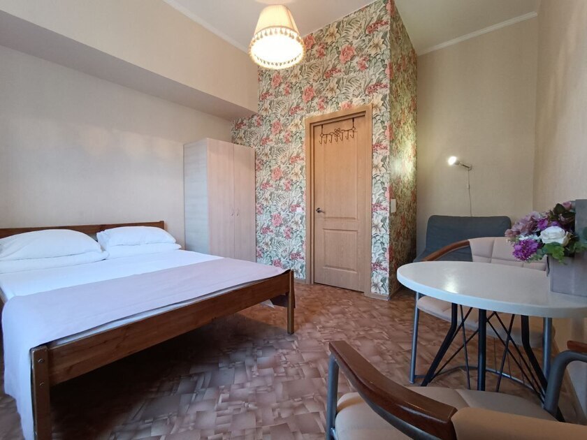Комната с одной двуспальной кроватью идеальна для пар, индивидуальных путешественников и для командировочных. Для хранения одежды вешалки, прикроватная тумба со светильником. Для комфорта гостей есть полотенца.
