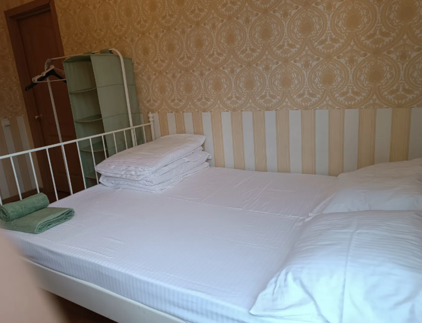 Комната оснащена двуспальной кроватью 140*200 см, и полуторной кресло-кроватью 90*200. Для хранения одежды шкаф и прикроватная тумба со светильником. Для комфорта гостей есть полотенца, тапочки резиновые, постельное белье высокого качества из 100% хлопка страйп-сатин.