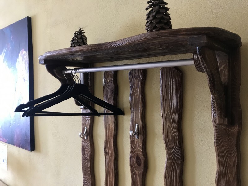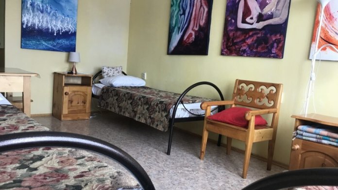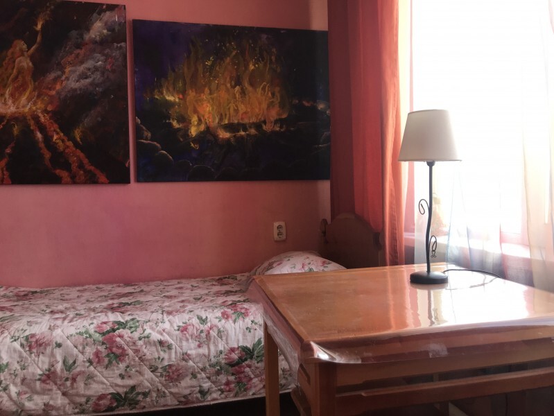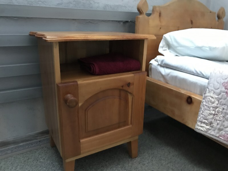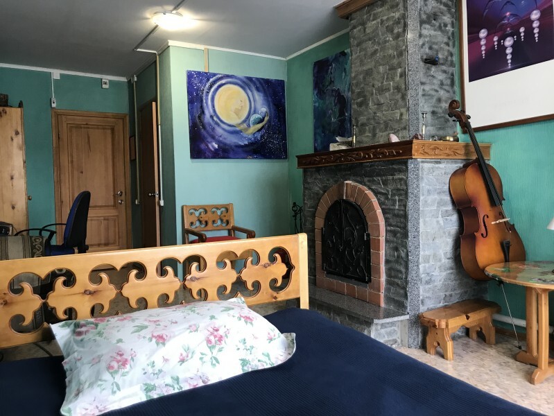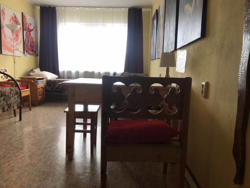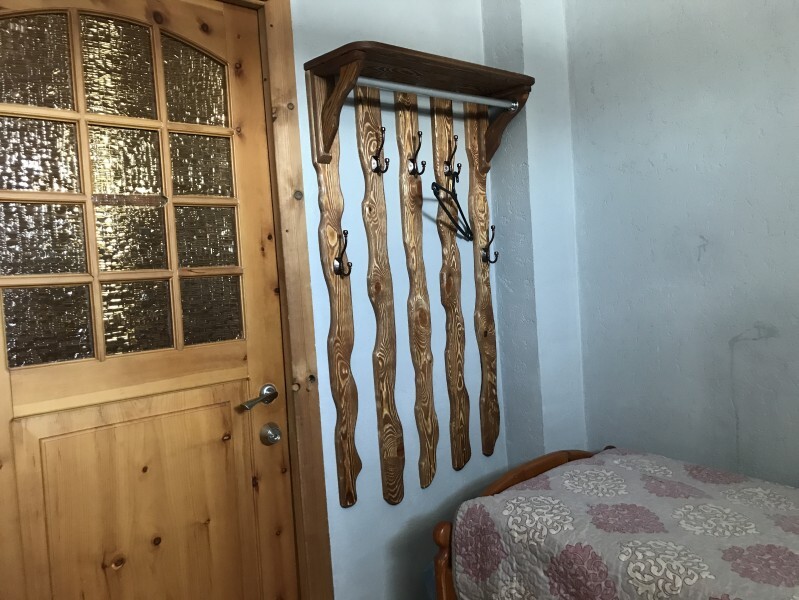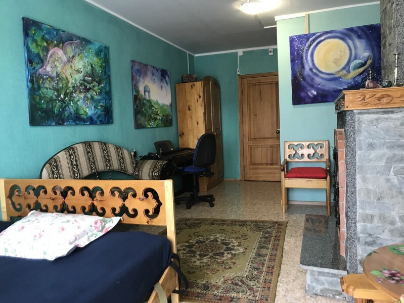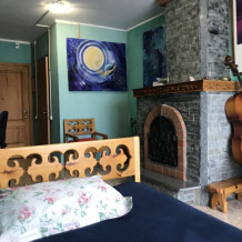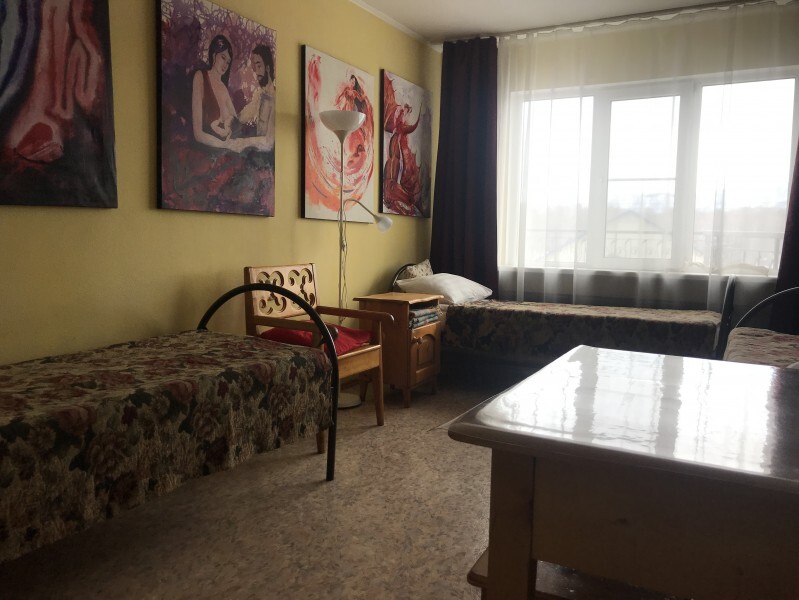 В комнате 3 кедровые кровати, белое белье, полотенца. Тумбочка и полки для одежды, стол. Туалет рядом с комнатой. В других комнатах на этаже есть свои туалеты. Душ на 1 этаже. Стены украшены картинами американской художницы К.Хилтон. Можно воспользоваться общей кухней или заказать питание.