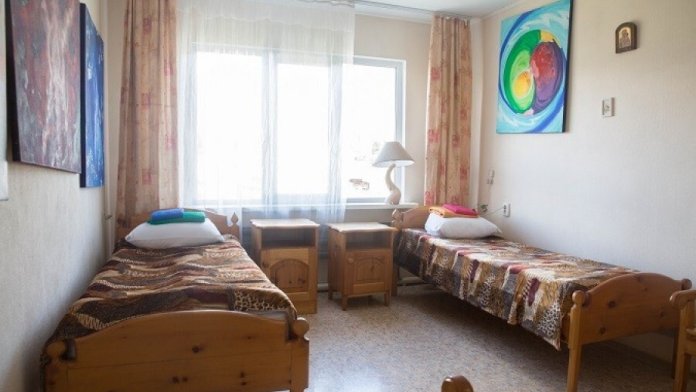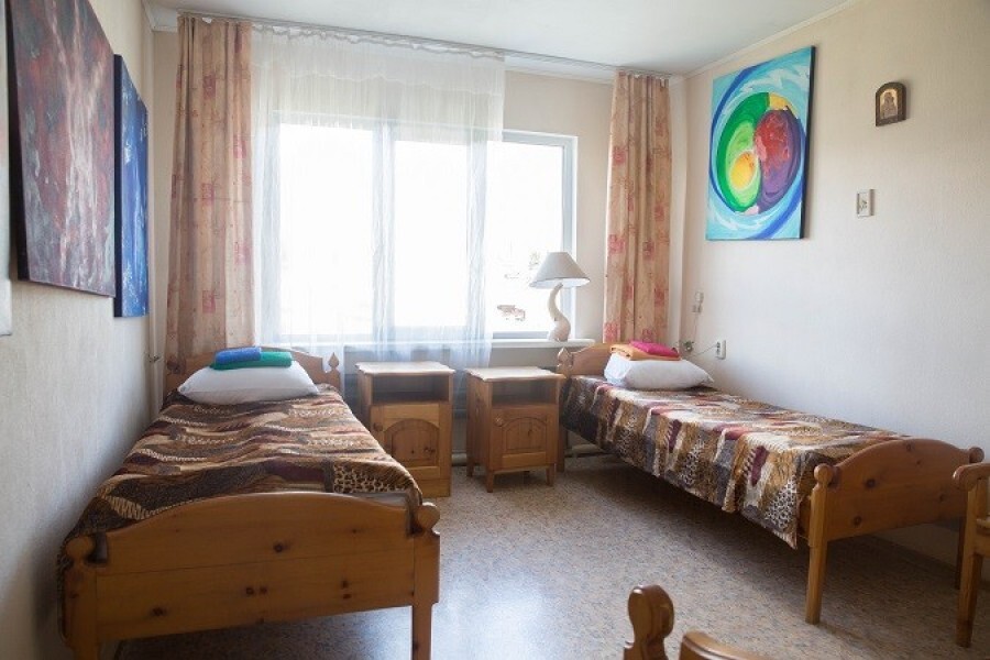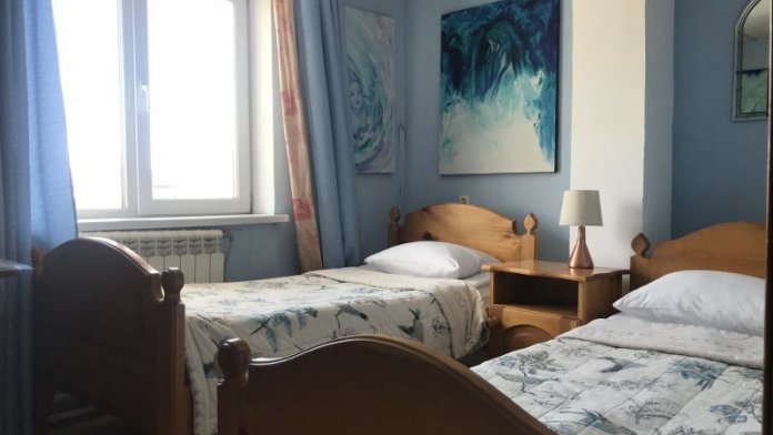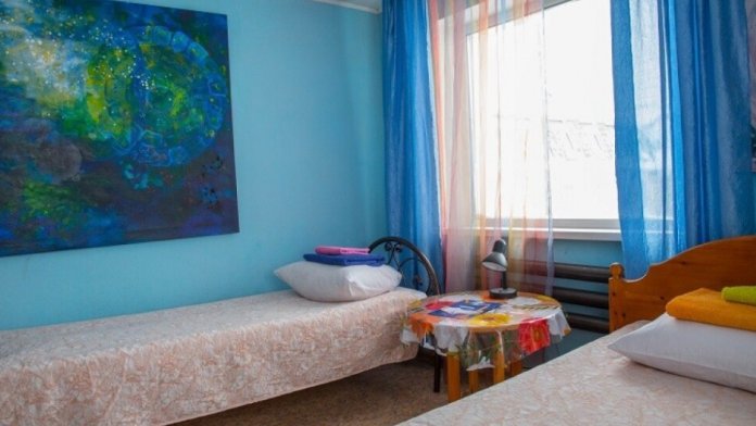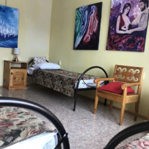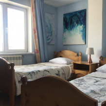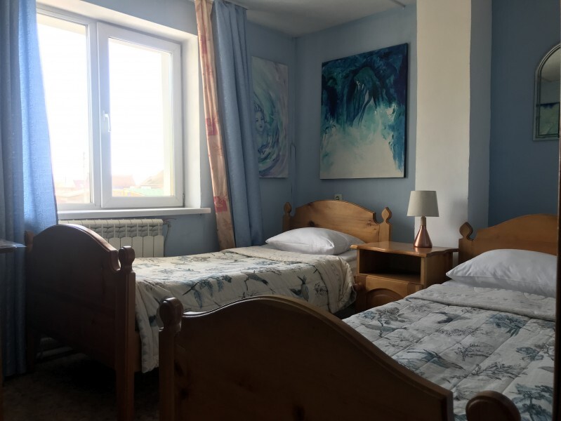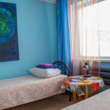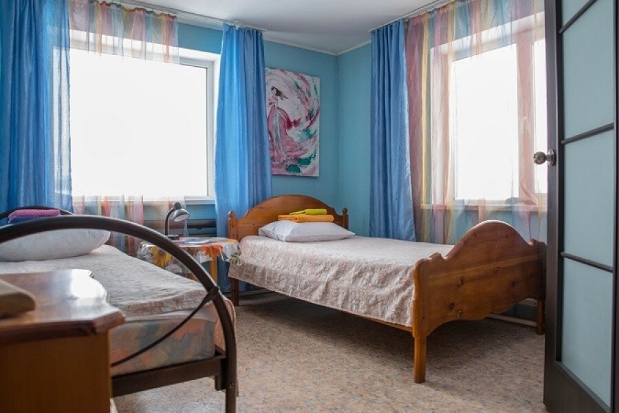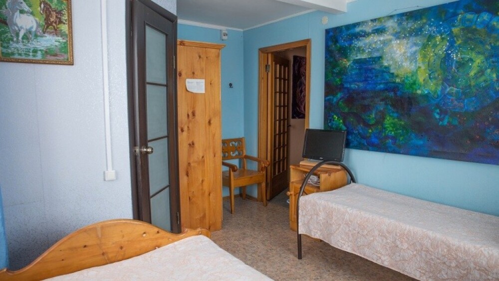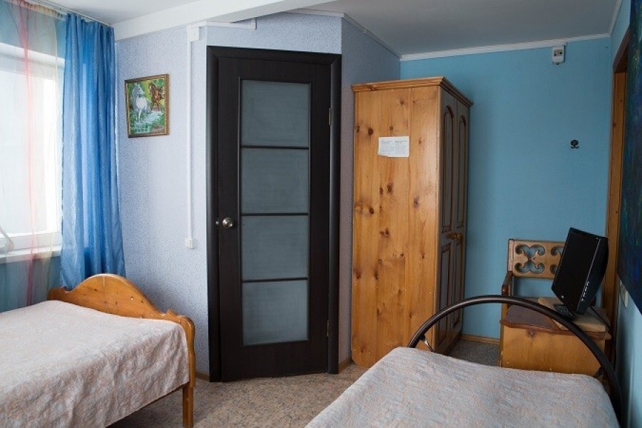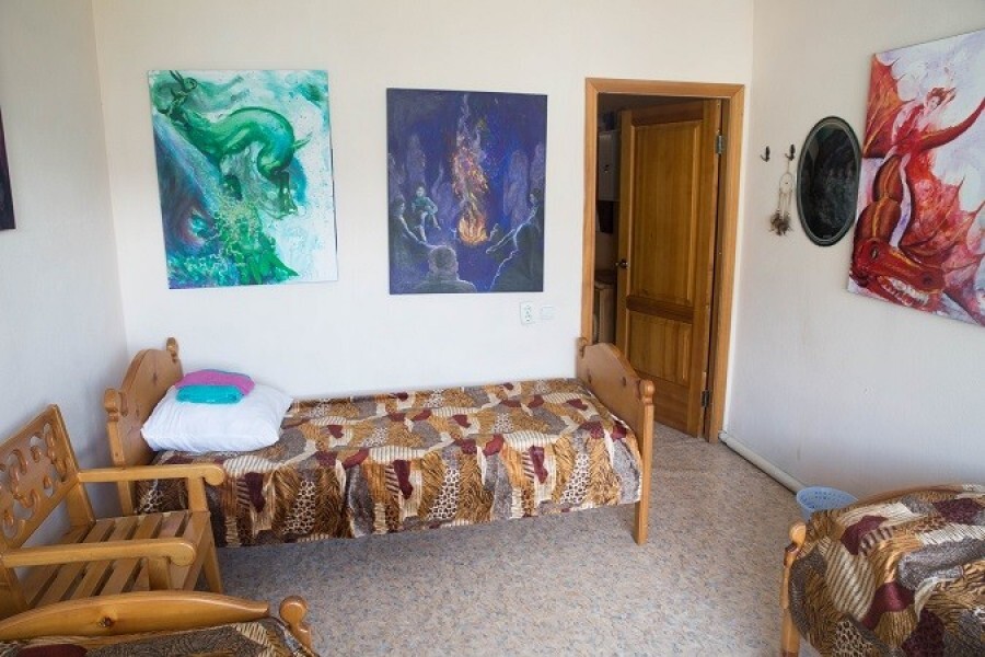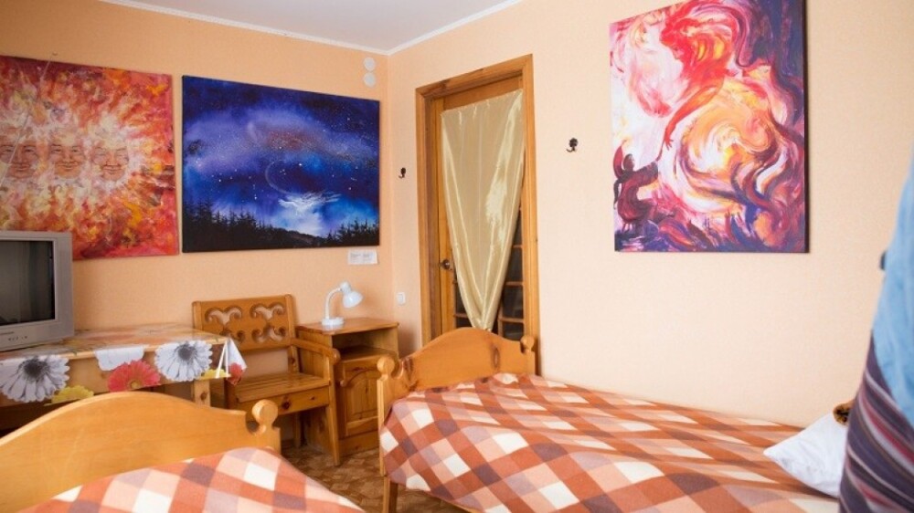 Двухместный номер класса эконом расположен на первом этаже гостевого дома. В комнате две кедровые кровати, белое белье, полотенца. Тумбочка и полки для одежды, стол. Туалет, душ - на этаже. Стены украшены картинами американской художницы К.Хилтон. Можно воспользоваться общей кухней или заказать питание.