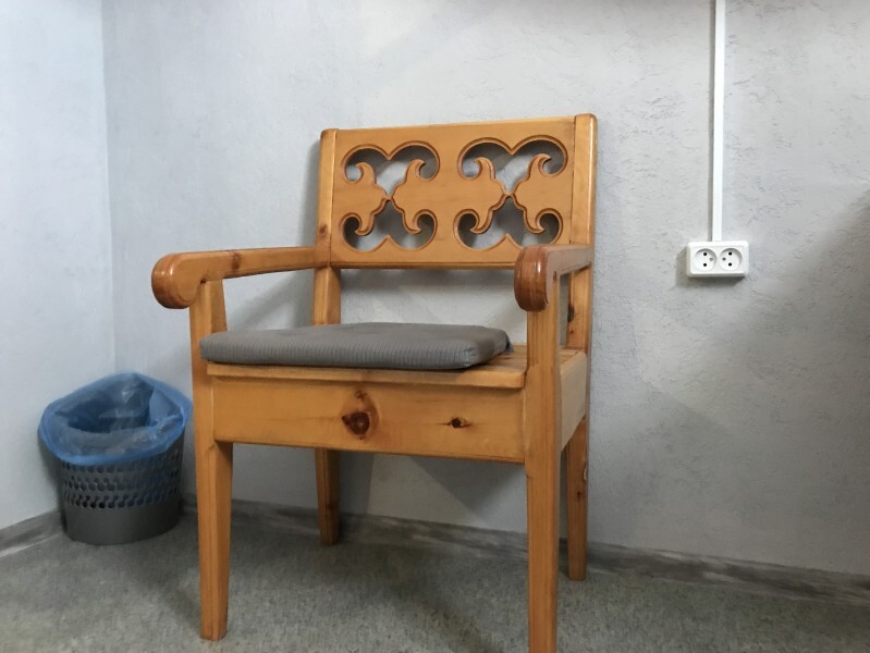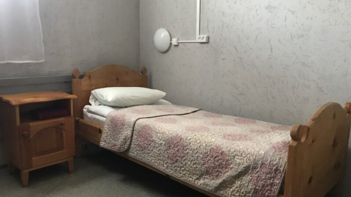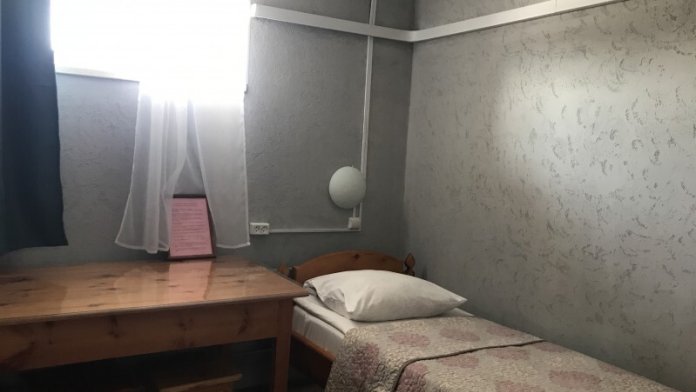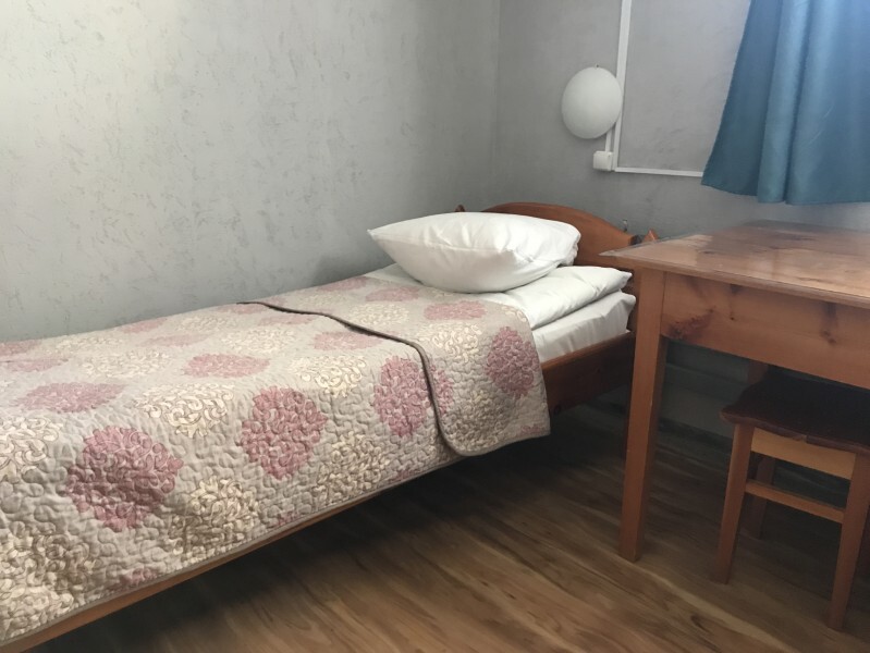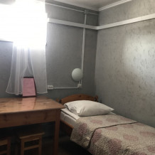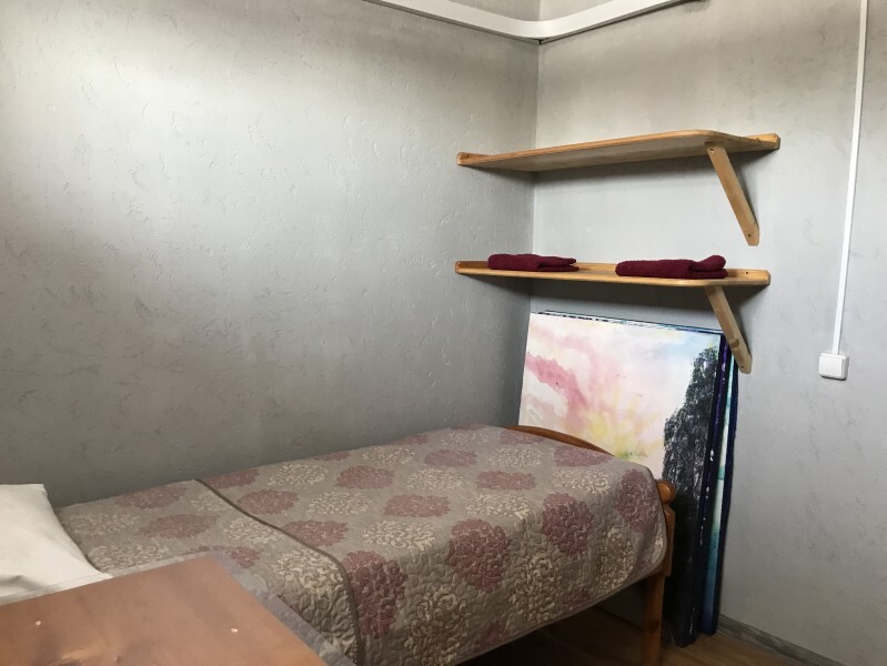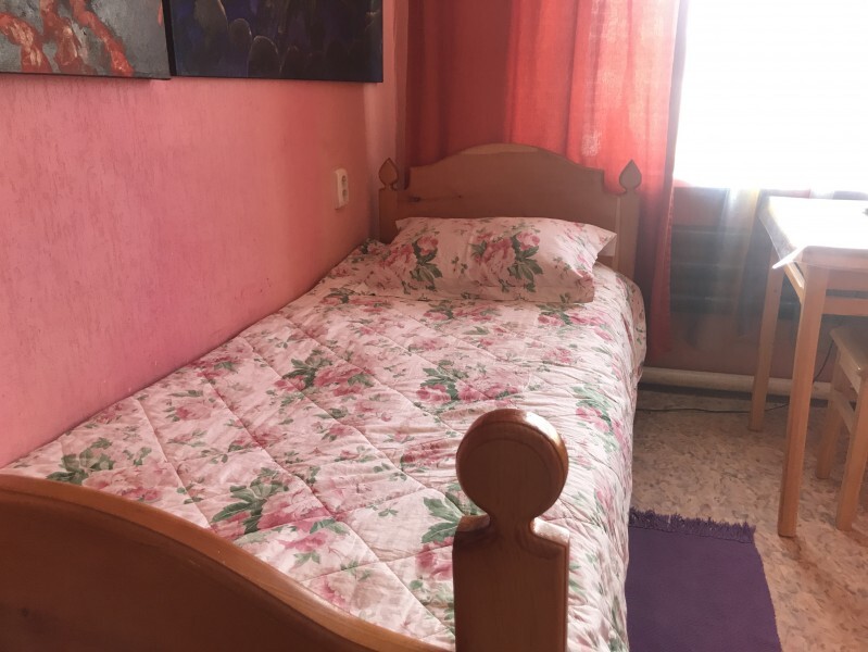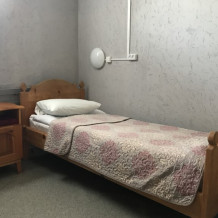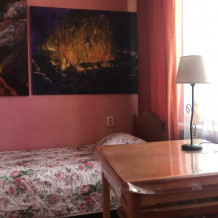 Одноместный номер эконом-класса расположен на цокольном этаже гостевого дома. В комнате кедровая кровать, белое белье, полотенце. Полки для одежды, стол, кедровый стул - кресло. Туалет, душ - на этаже. В комнате небольшое окно. Вид из окна на территорию гостевого дома. Стены украшены картинами американской художницы К.Хилтон. Можно воспользоваться общей кухней или заказать питание