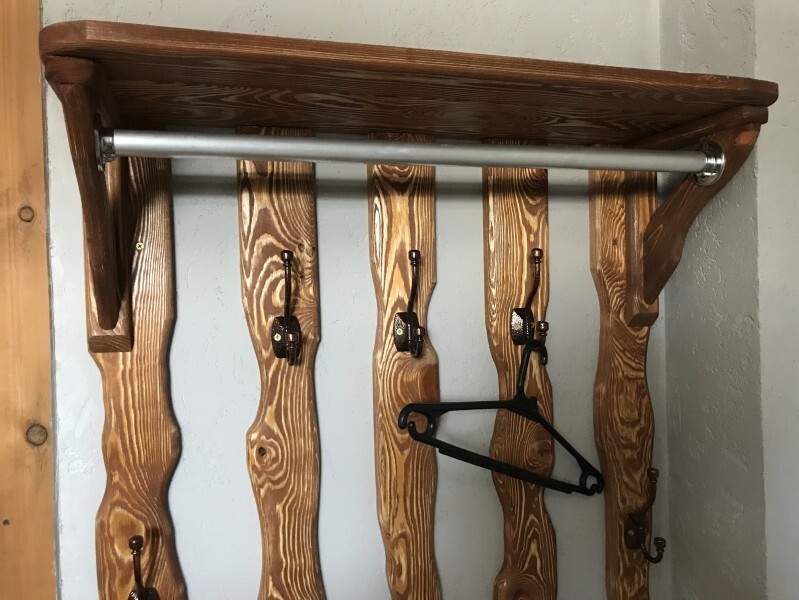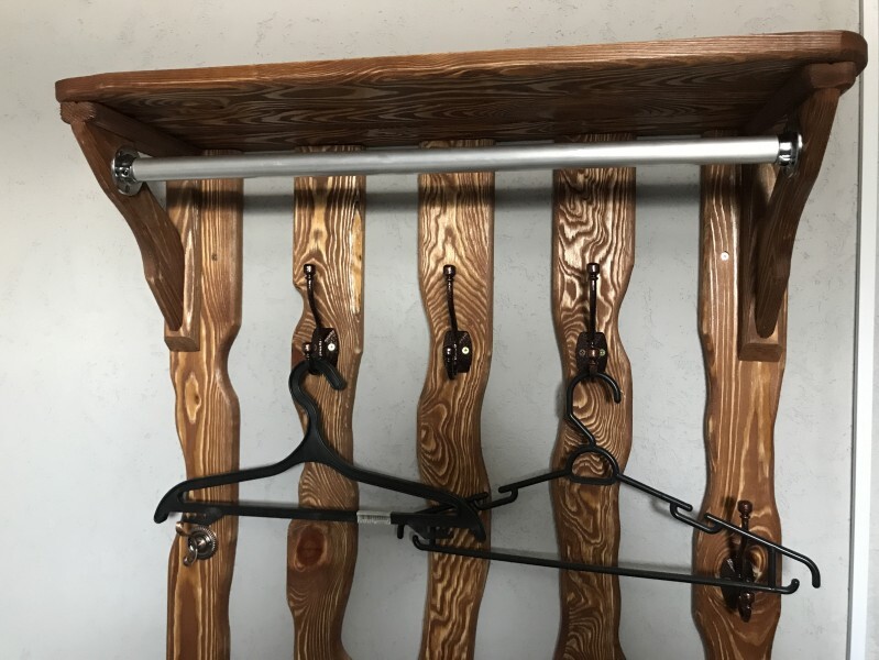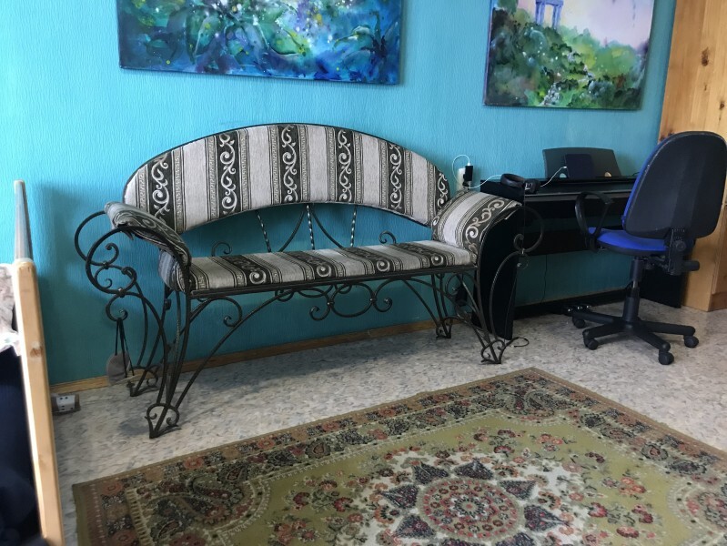 Имеется двуспальная кровать, кованный диван, кедровый шифоньер, шкаф для вещей, кедровый круглый журнальный столик, настольная лампа, плотные шторы.