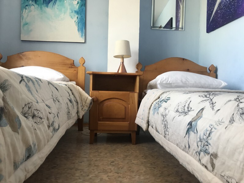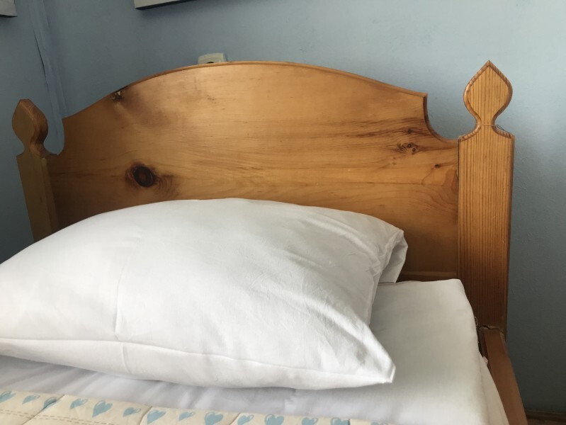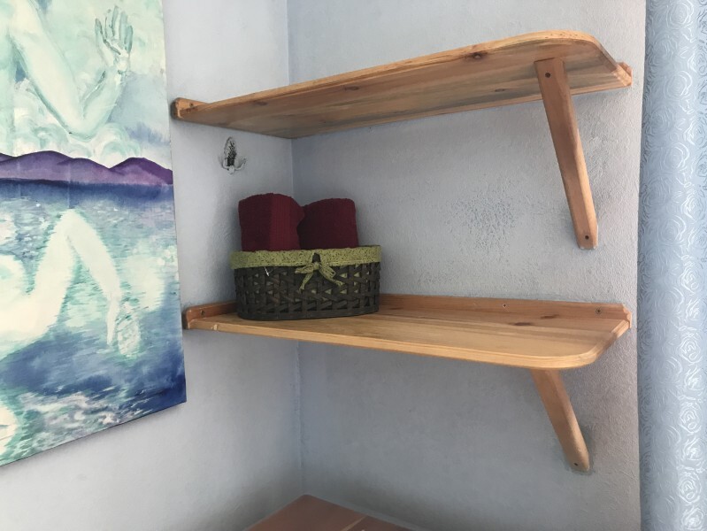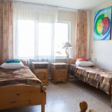 В комнате 2 кедровые кровати, белое белье, полотенце. Тумбочка и полки для одежды, стол, туалет и душ. Стены украшены картинами американской художницы К. Хилтон. Можно воспользоваться общей кухней или заказать питание.