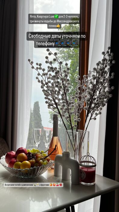 Сдаётся от Собственника люксовая , видовая квартира-студия площадью 35м2, 3/6 элитного дома. Дом расположен в 100 метрах от знаменитого Массандровского пляжа. В квартире современный свежий дизайнерский ремонт с балконом. Есть все для жизни и отдыха: двуспальная ортопед. кровать, комфортный раскладной диван, детская кроватка и стульчик для кормления ( по запросу) , холодильник, микроволновка с функцией гриля, кондиционер, стиральная машина, фен, утюг, гладильная доска, электроплита, TV-(vip пакет HTB+), Wi-Fi, индивидуальный сейф.