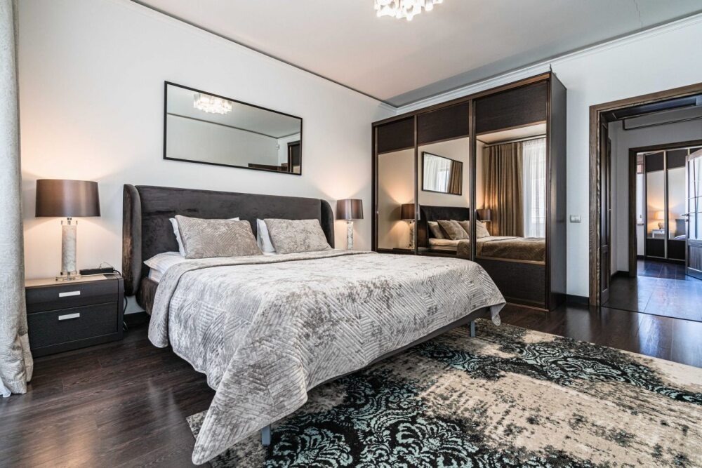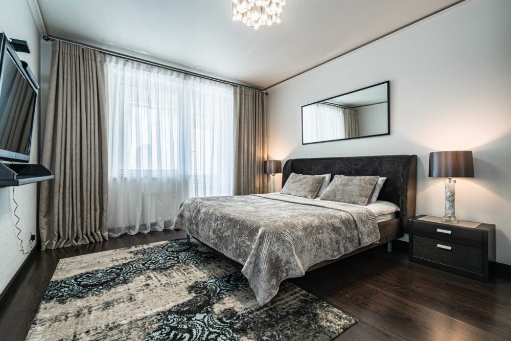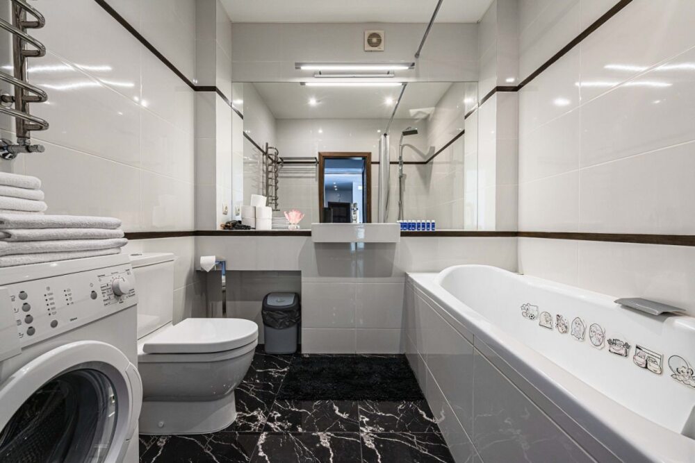 Интерьер стильной квартиры оформлен в чёрно-белой гамме. Для комфортного размещения гостей здесь есть современная и качественная мебель, собственная ванная комната со стиральной машиной, кондиционер, два телевизора.
