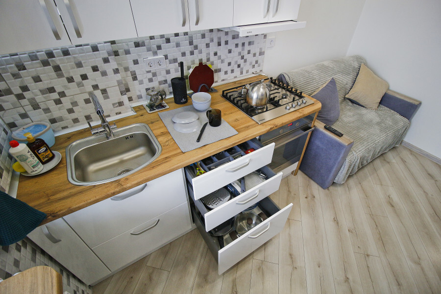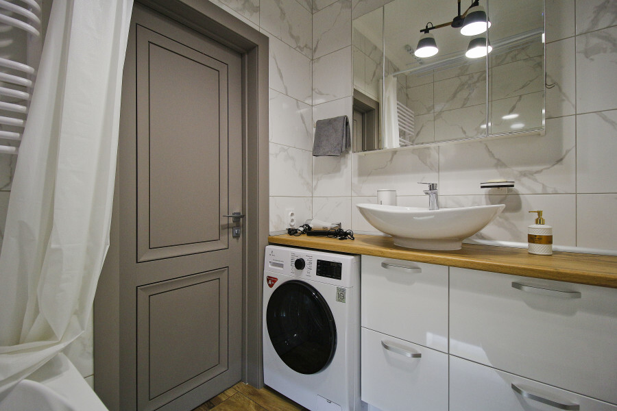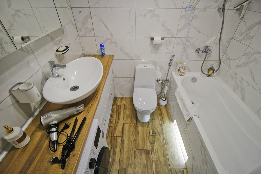 Квартира оборудована всем необходимым для проживания. Здесь вы найдете автономное отопление с датчиком температуры, а также кондиционер, стиральную машину, микроволновку, холодильник, плиту с духовкой. Для вашего удобства мы предоставили турку, кофе и чай, зонт и множество полезных мелочей.