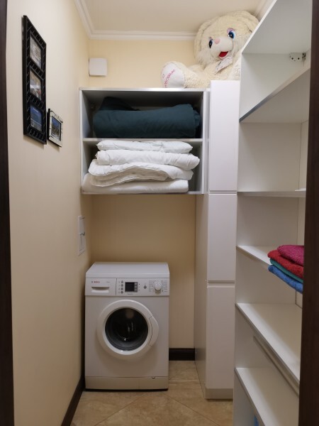 1. Полный набор техники — фен, плойка, утюг, гладильная доска, стиральная машина Бош, микроволновая печь Бош, холодильник Сименс и всё необходимое для приготовления кофе и чая.