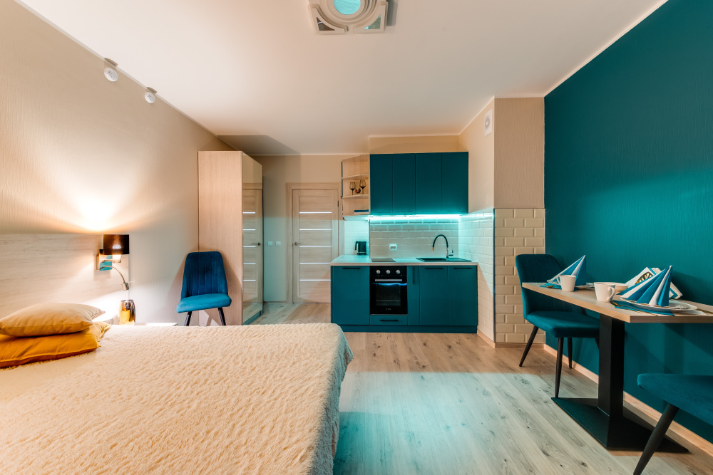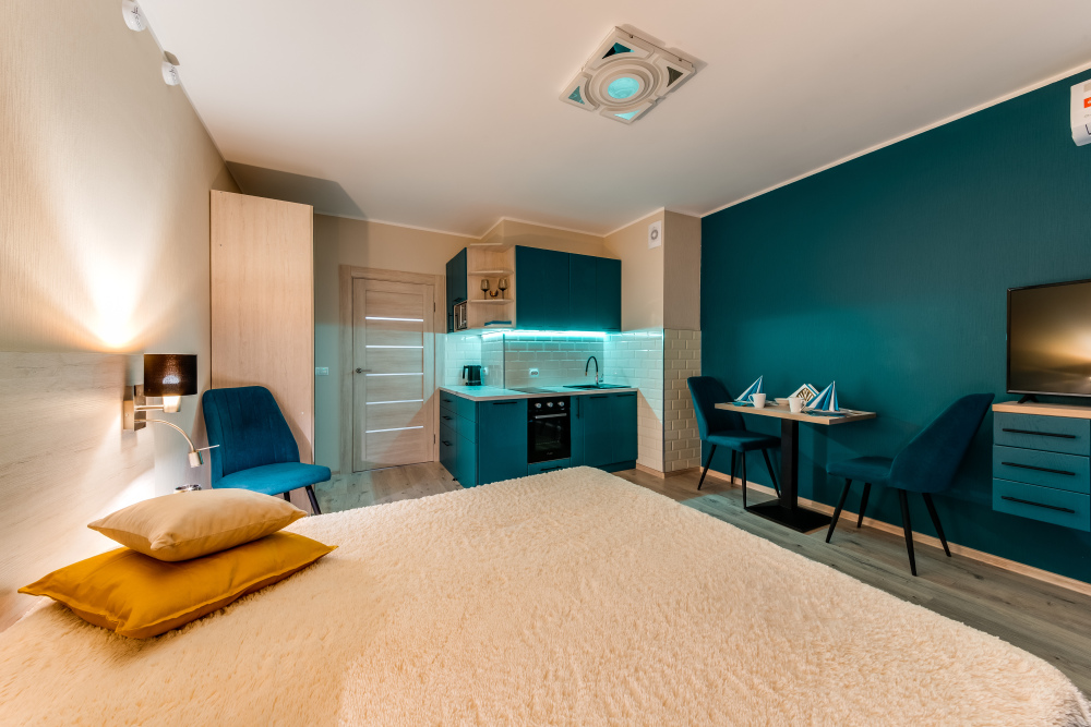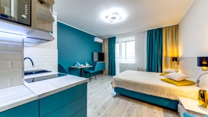 Апартамент 30 кв.м более просторный, улучшенный. Единое пространство с оборудованной кухней, обеденной и спальной зонами и балконом с гардеробом. Один из самых больших апартаментов-студий в комплексе.