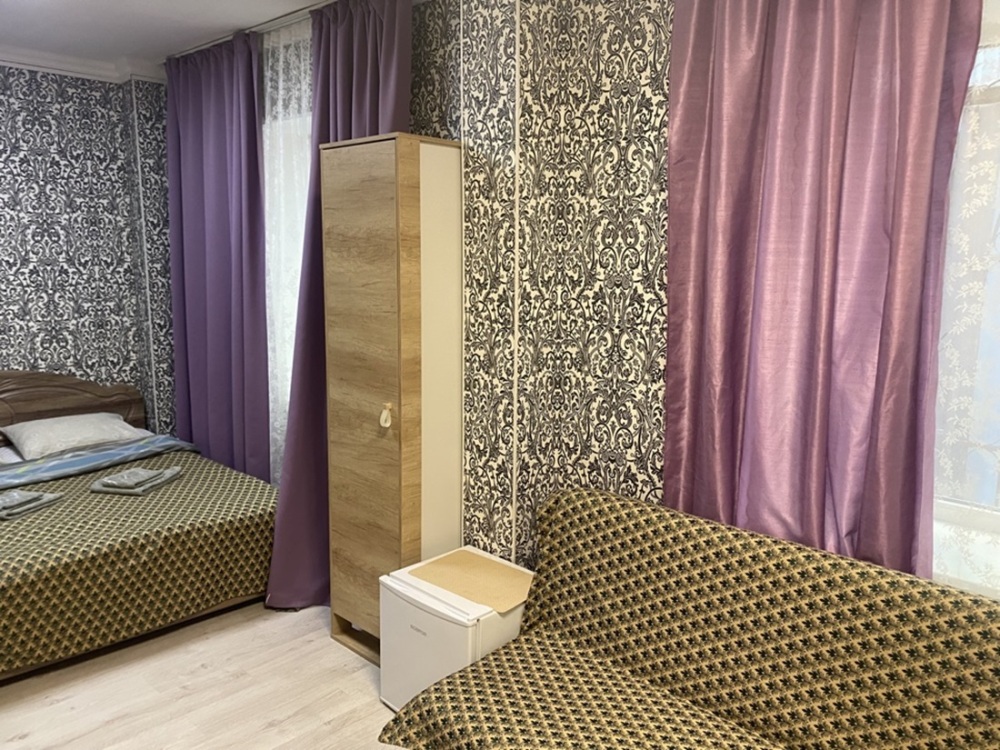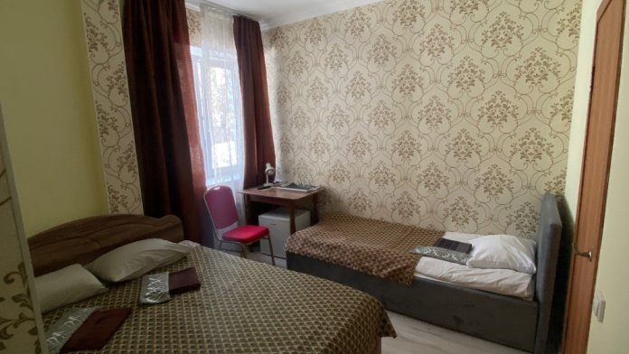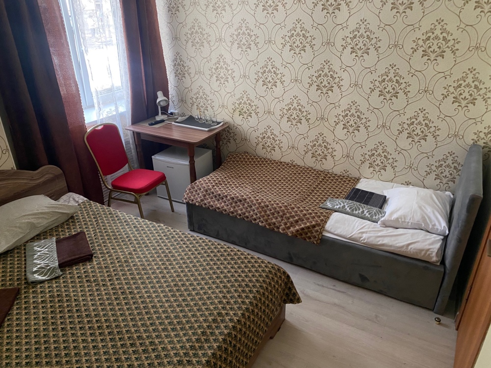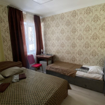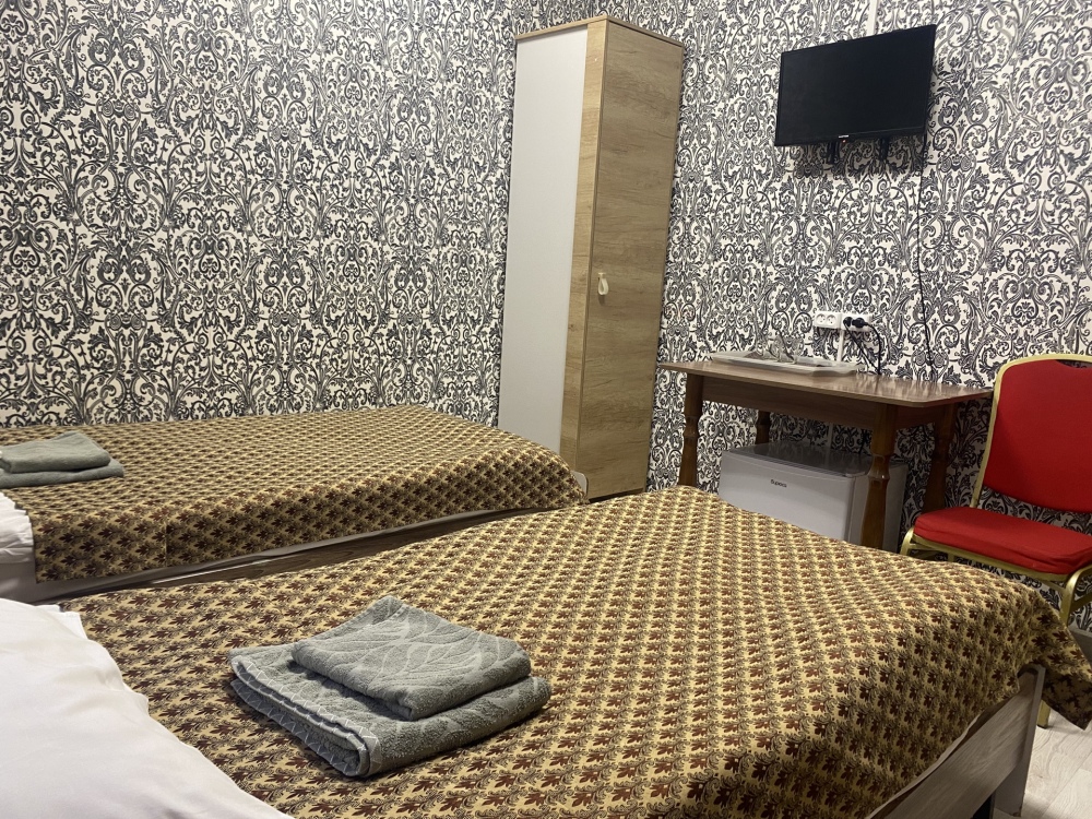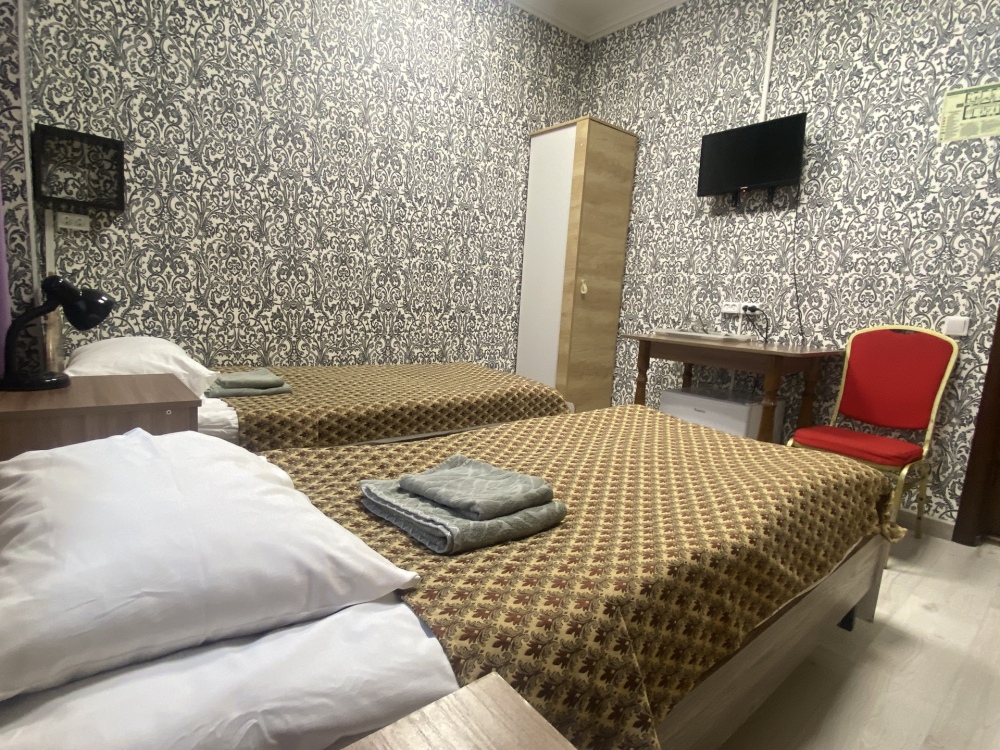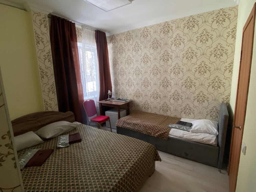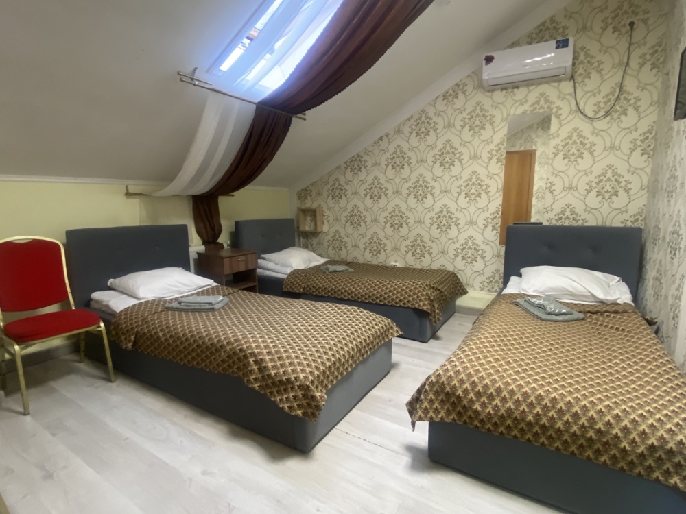 В номере: 1-а двухспальная кровать и 1-а односпальная кровать или 3-и односпальные кровати, тумбочки, ТВ, стол, стул, вешалка для одежды. Пол: ламинат. Кондиционер (выборочно).