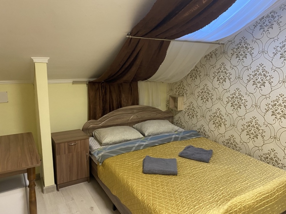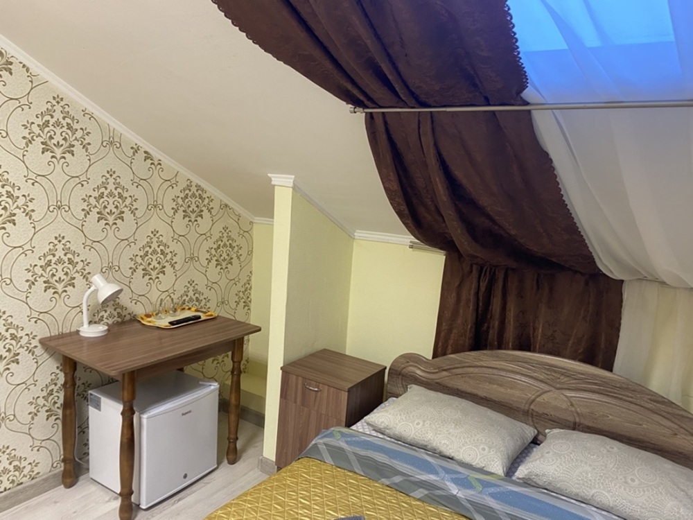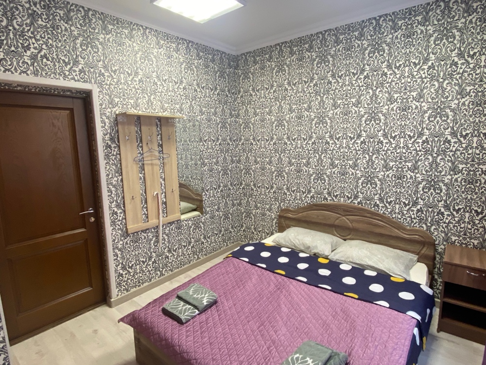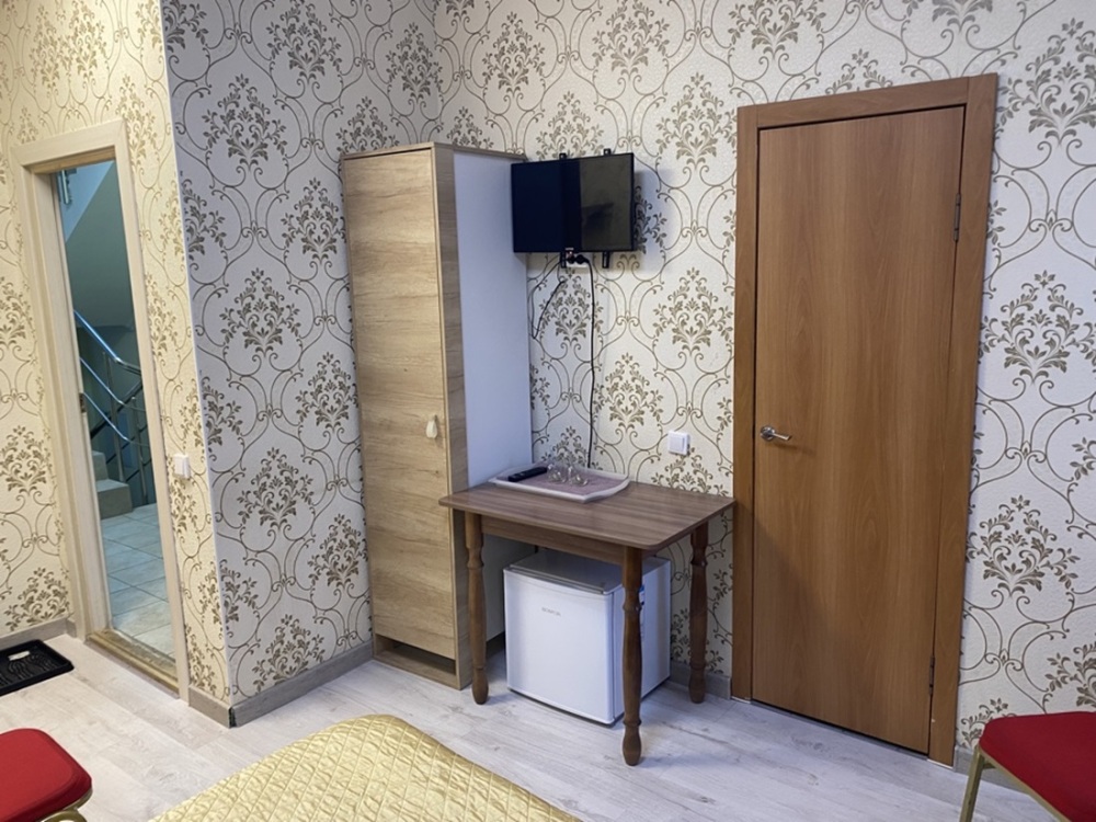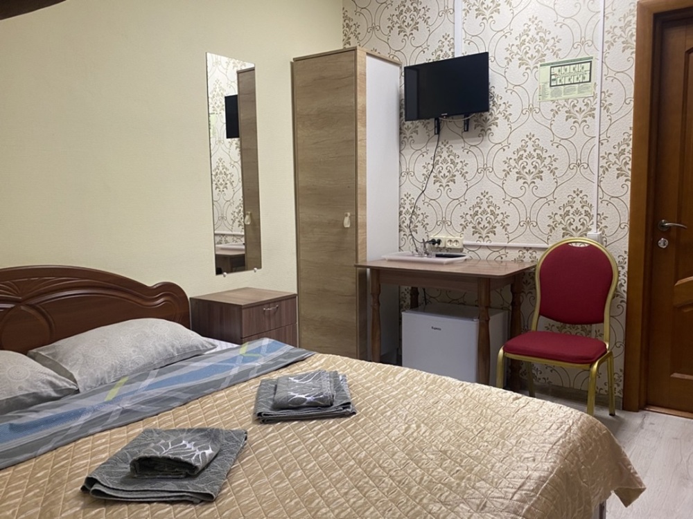 В номере: двухспальная кровать, тумбочки, ТВ, стол, стул, вешалка для одежды. Пол: ламинат.
