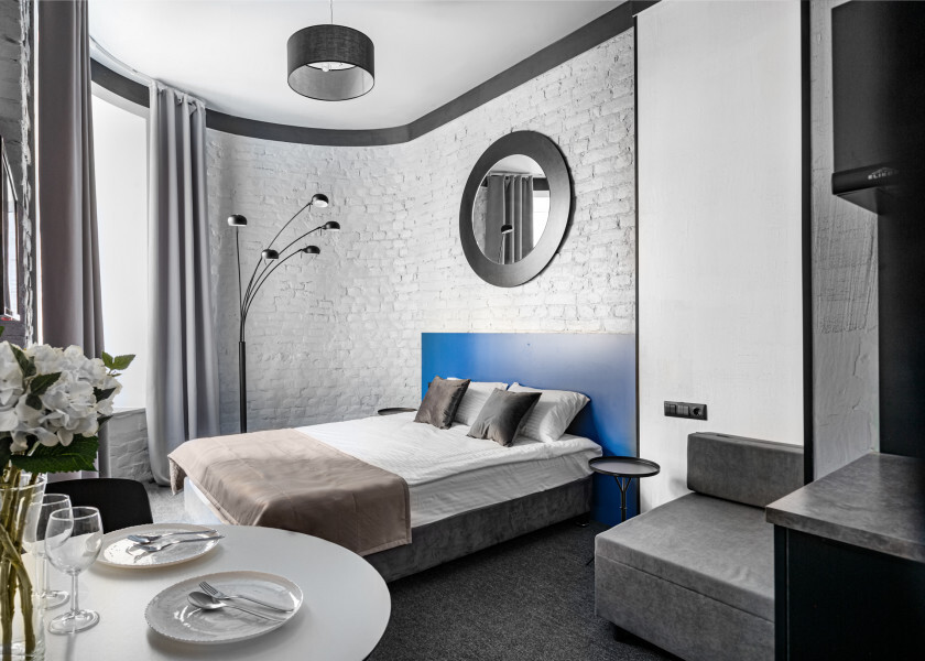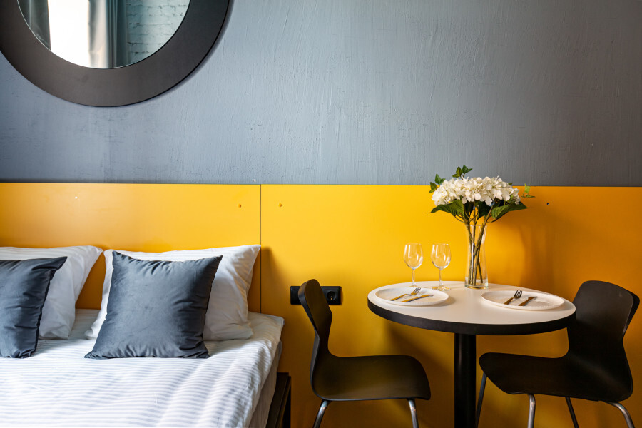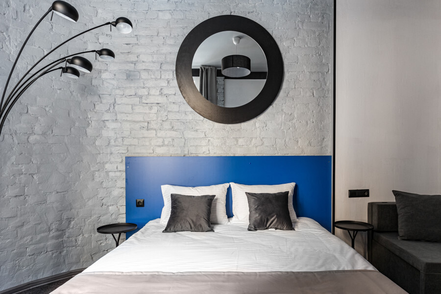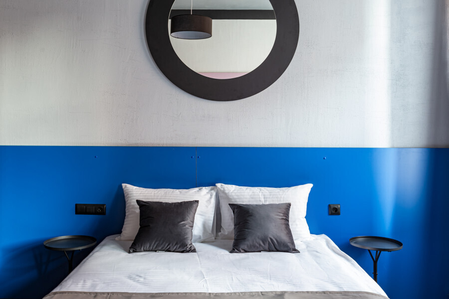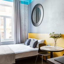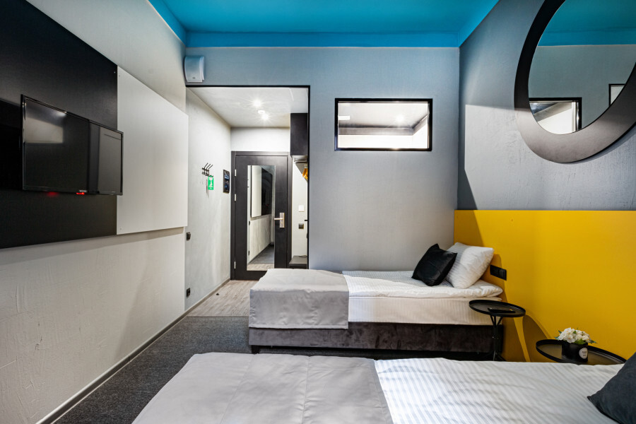 Номер площадью 22 м2. с 1 двуспальной кроватью 160*200 см. и раскладной кроватью для третьего гостя. Вместимость номера - 3 гостя.