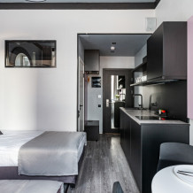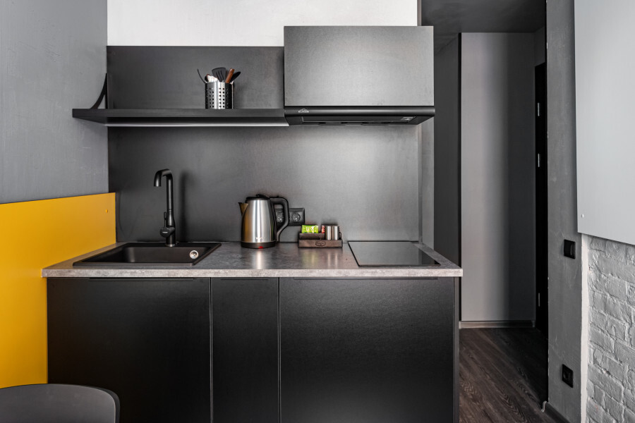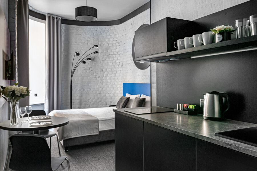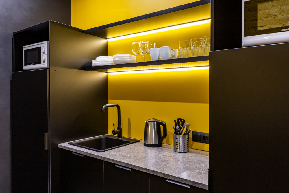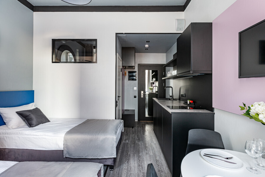 В номере: мини-кухня (микроволновая печь, плита, холодильник, посуда, столовые приборы, чайник), телевизор, обеденный стол, шкаф, вешалки, зеркало, стул, тапочки, светонепроницаемые шторы.