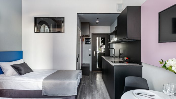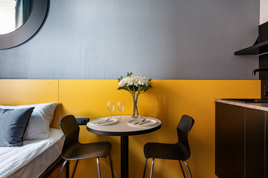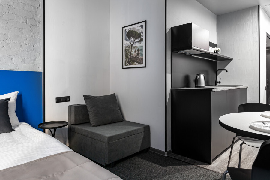 В номере: мини-кухня (микроволновая печь, плита, холодильник, посуда, столовые приборы, чайник), телевизор, кресло, письменный стол, тумба, обеденный стол, шкаф, вешалки, зеркало, стул, тапочки, светонепроницаемые шторы.