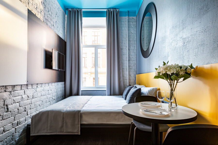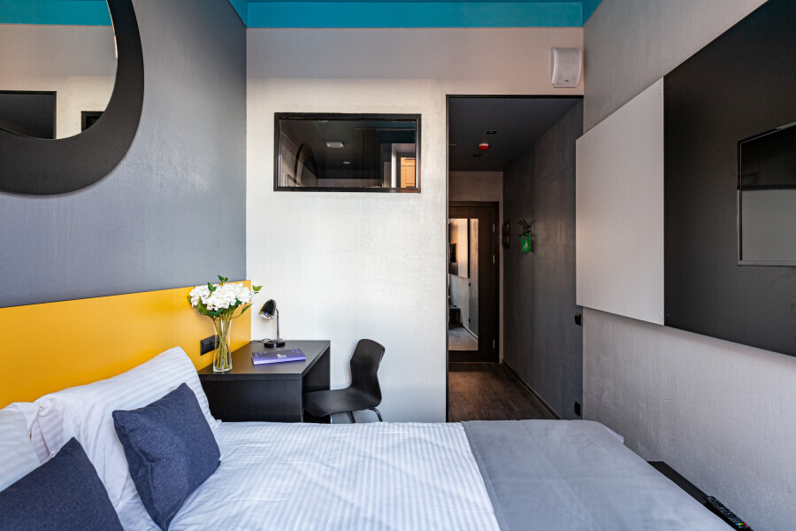 Номер площадью 12 м2. с 1 двуспальной кроватью 160*200 см. Вместимость номера - 2 гостя.