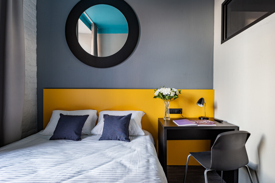 Номер площадью 15 м2. с 1 двуспальной кроватью 160*200 см. Вместимость номера - 2 гостя.