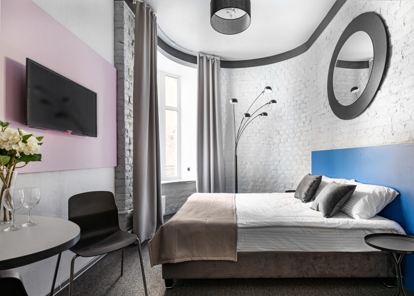 В номере: телевизор, шкаф, вешалки, зеркало, тумба, стул, тапочки, светонепроницаемые шторы.