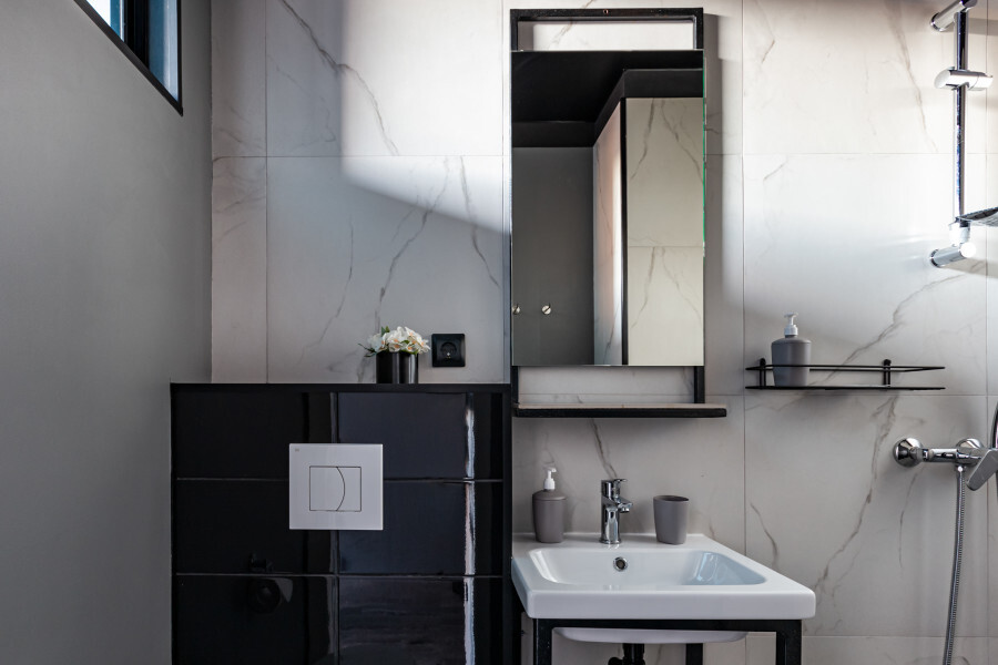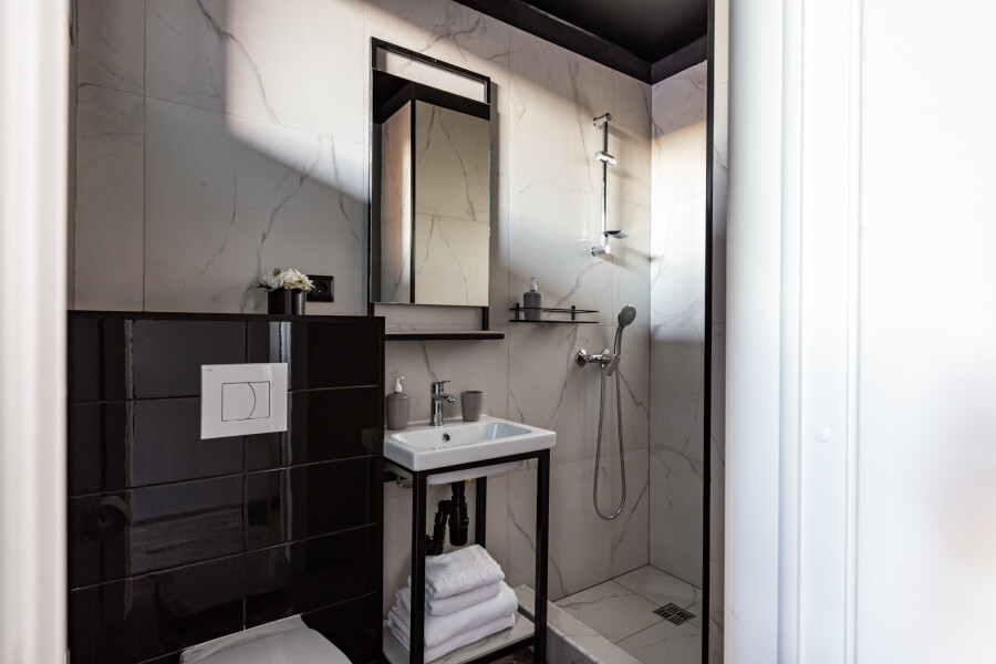 В ванной комнате: душ, туалет, раковина, полотенца, туалетно-косметические принадлежности, фен.