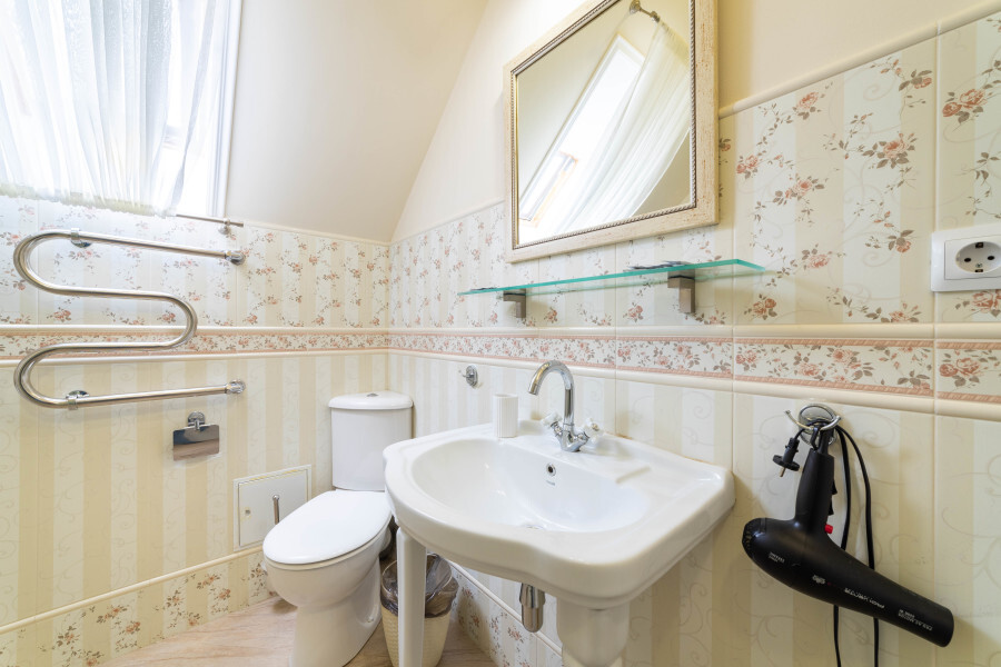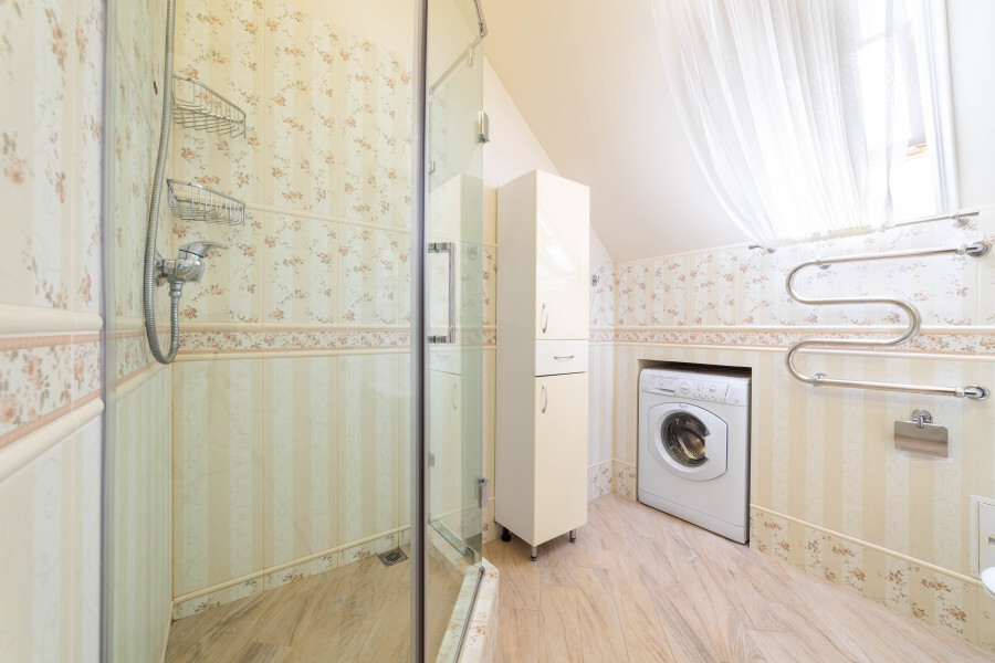 Ванная комната со всем необходимым: полотенца, тапочки, мыльные принадлежности, фен, стиральная машина.