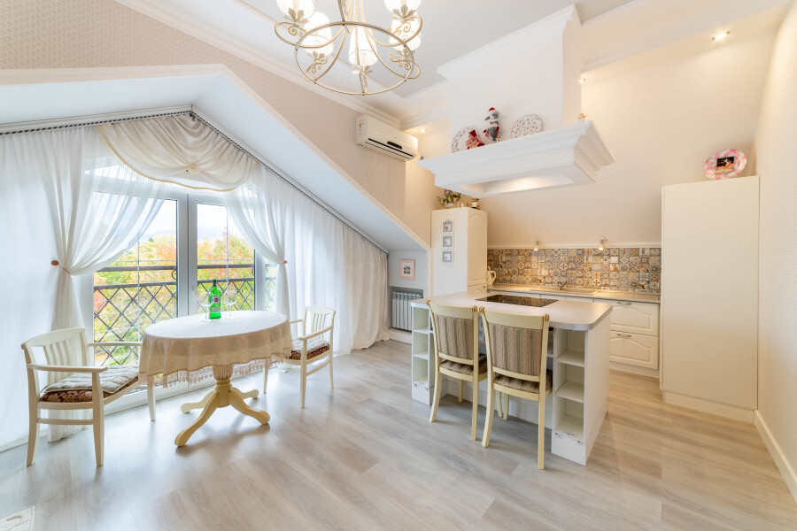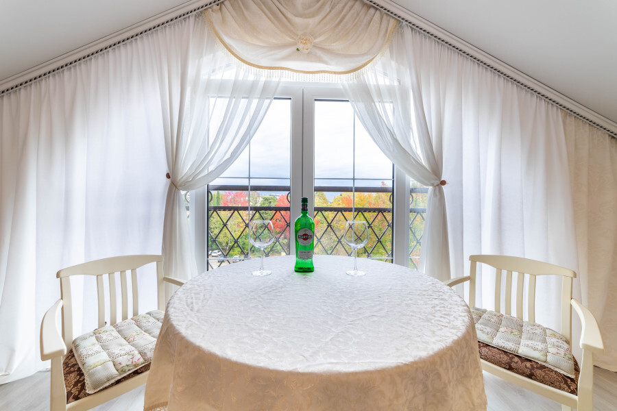 Широкая двуспальная кровать, большой шкаф, кондиционер, уютный диван, стол и стулья для комфортного отдыха.