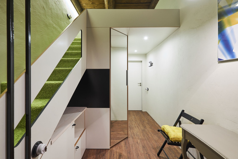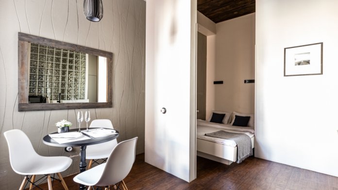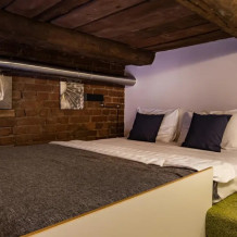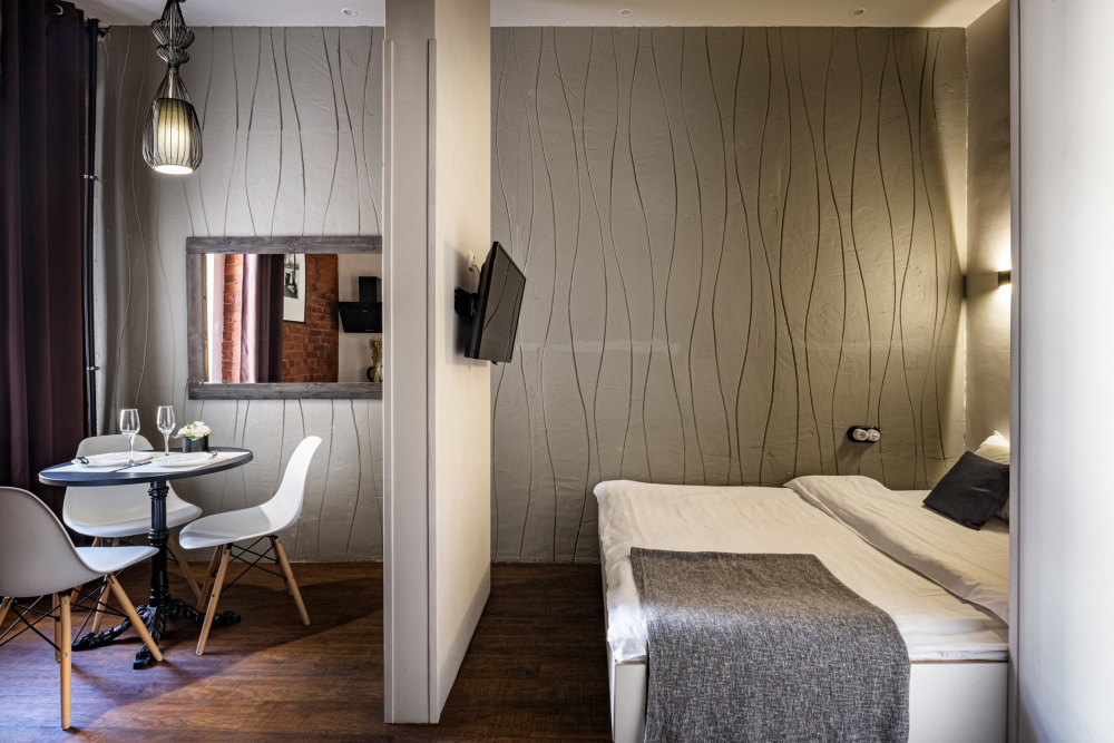 Апартаменты площадью 21 м2. с 1 двуспальной кроватью 160*200 см. и 1 односпальной раскладной кроватью. Вместимость номера - 3 гостя. Всего номеров этой категории - 2 шт.
