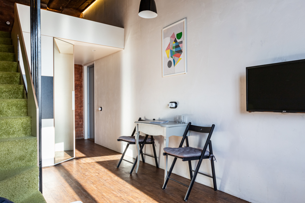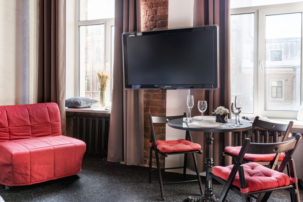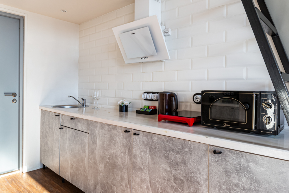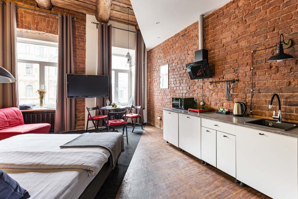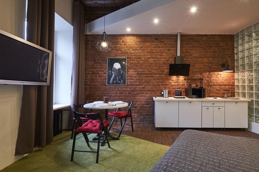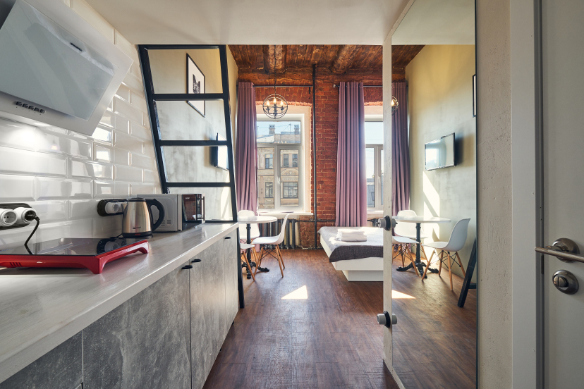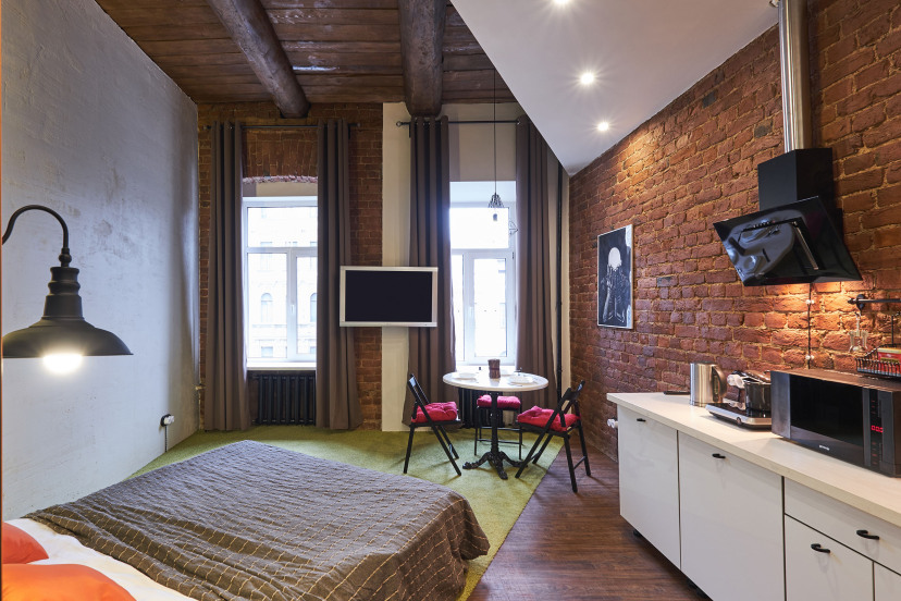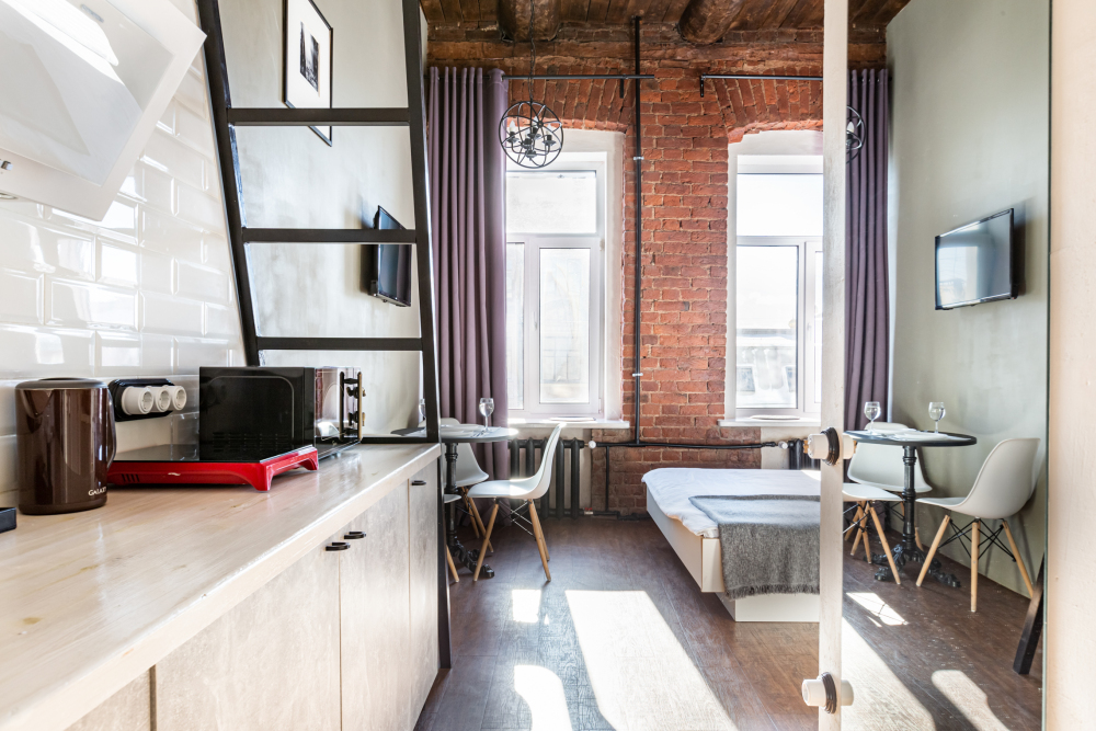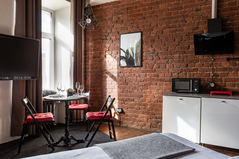 В студии: мини-кухня (микроволновая печь, плита, холодильник, посуда, столовые приборы, чайник), телевизор, кондиционер, высокие потолки, тумба, обеденный стол, шкаф, вешалки, зеркало, стул, тапочки, светонепроницаемые шторы.