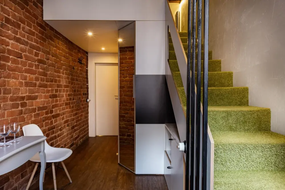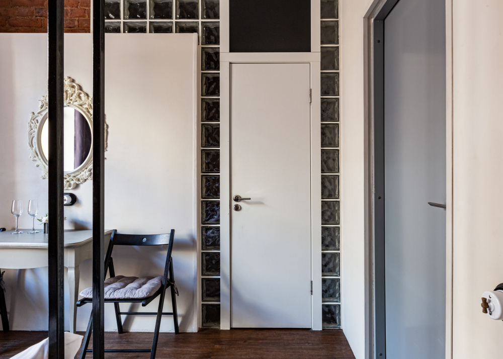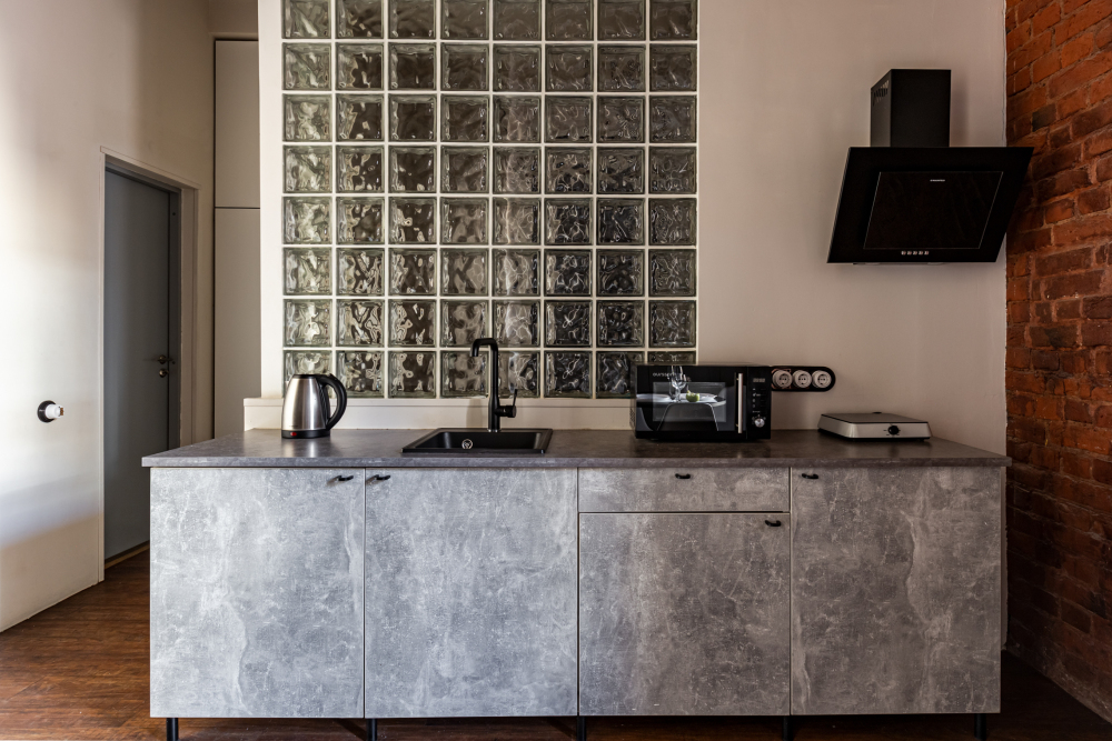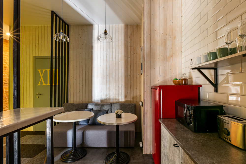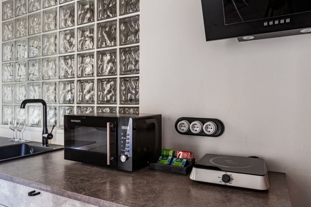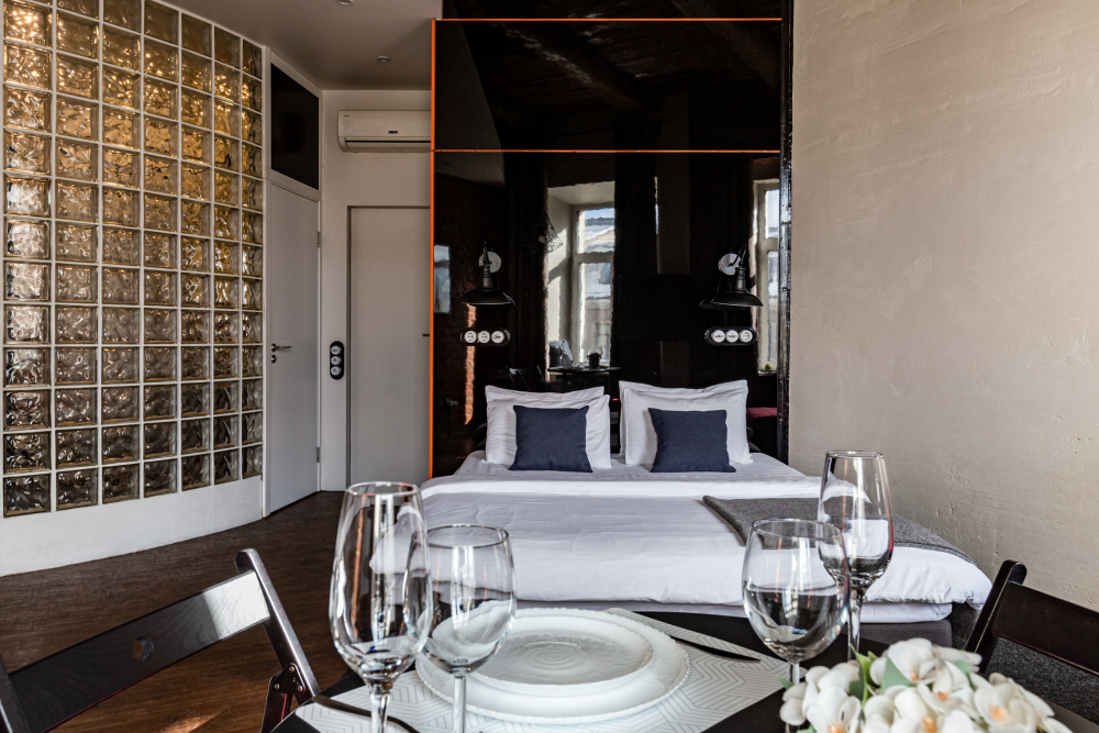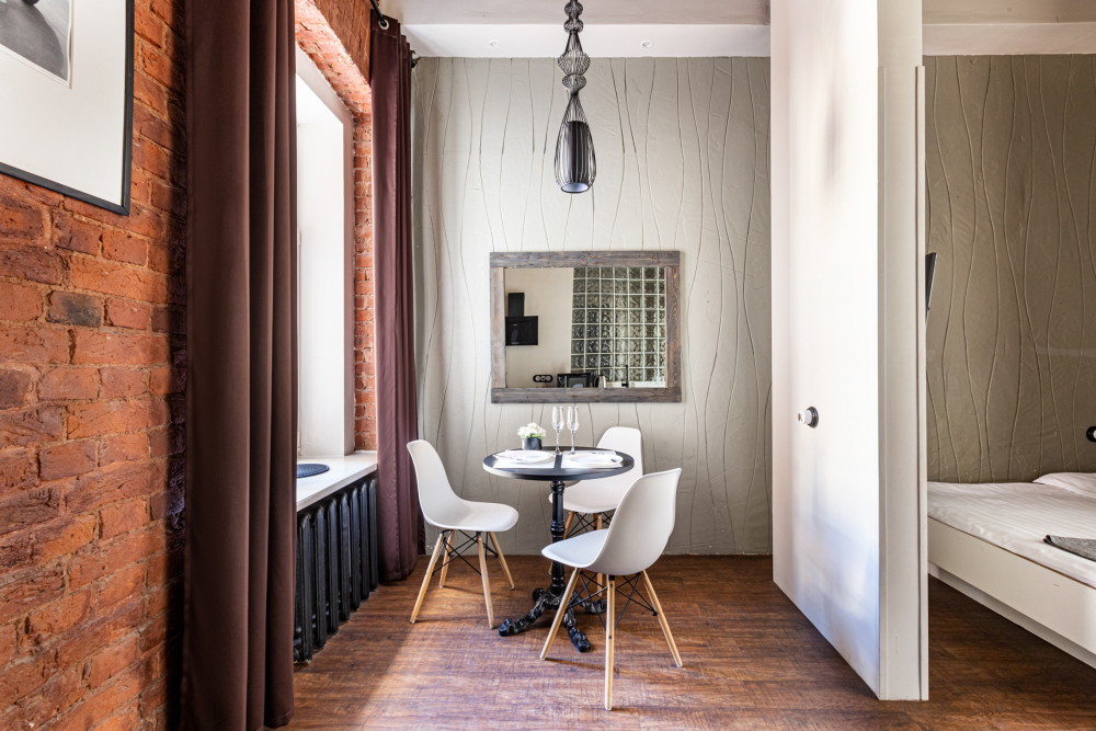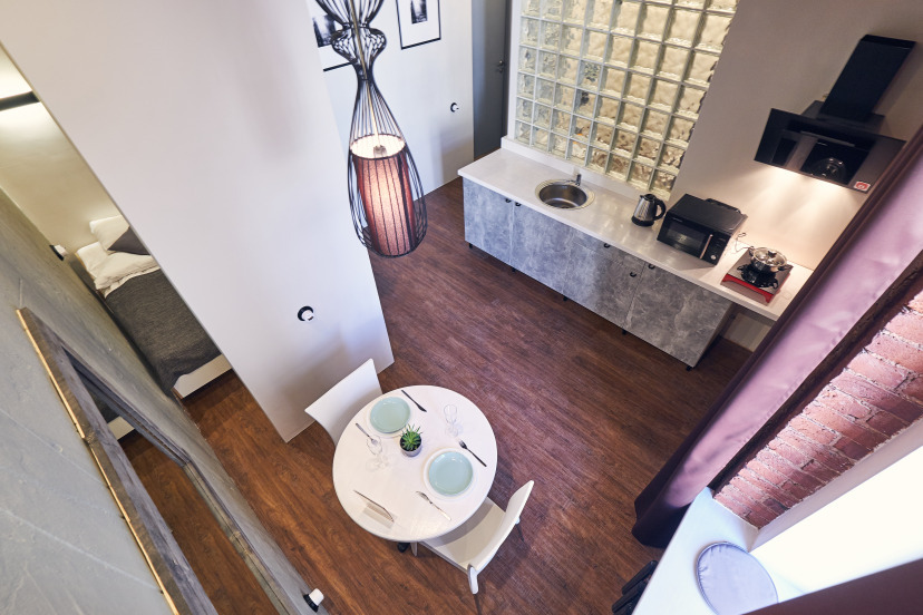 В студии: мини-кухня (микроволновая печь, плита, холодильник, посуда, столовые приборы, чайник), телевизор, кондиционер, высокие потолки, тумба, обеденный стол, шкаф, вешалки, зеркало, стул, тапочки, светонепроницаемые шторы.