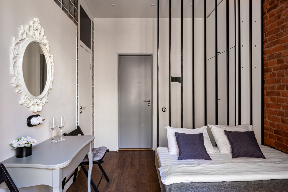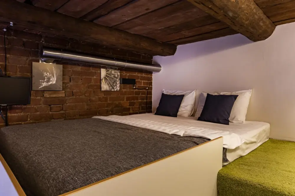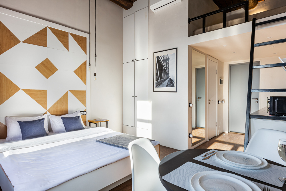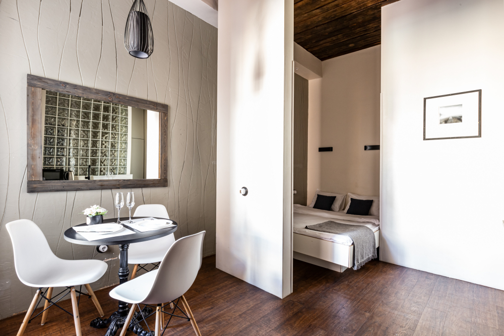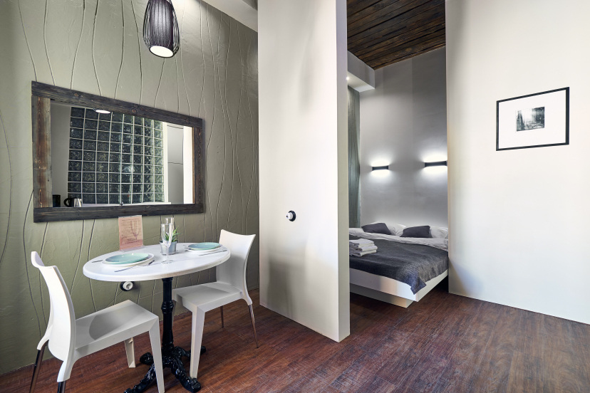 Студия площадью 21 м2. с 2 двуспальными кроватями 160*200 см. Вместимость номера - 4 гостя. Всего номеров этой категории - 1 шт.