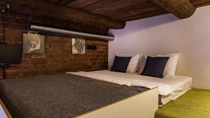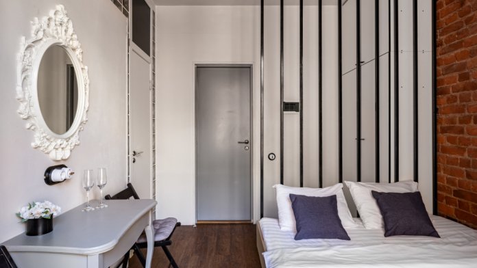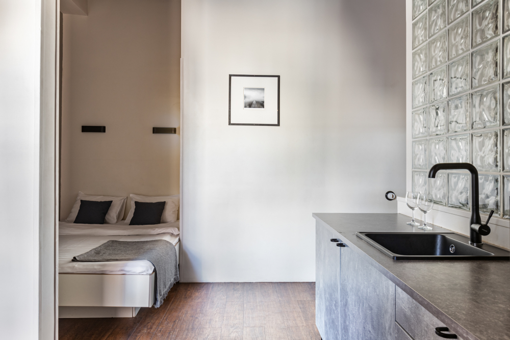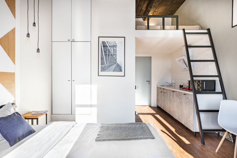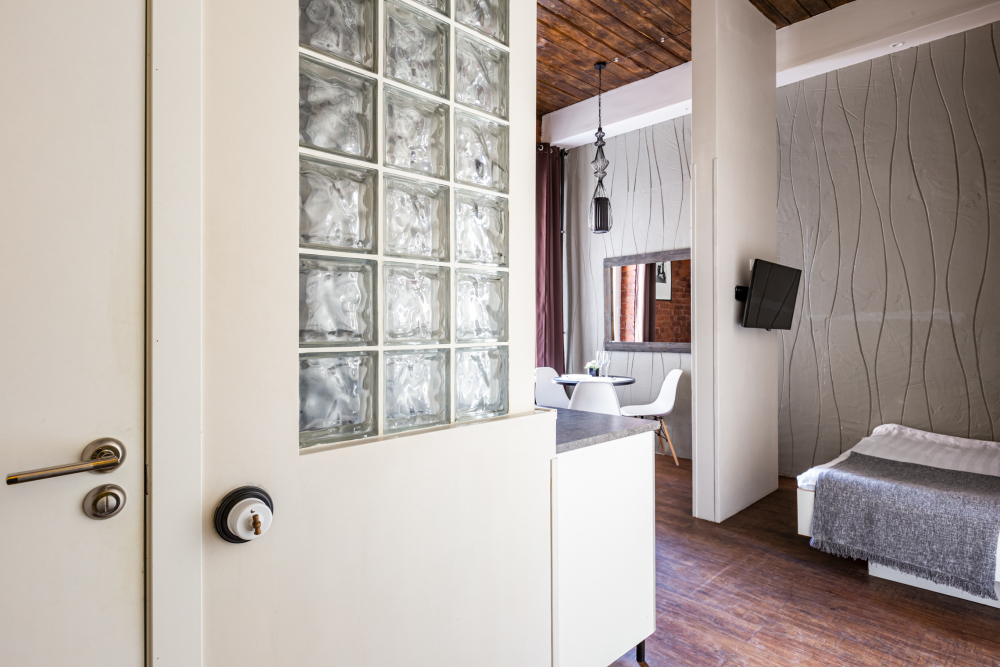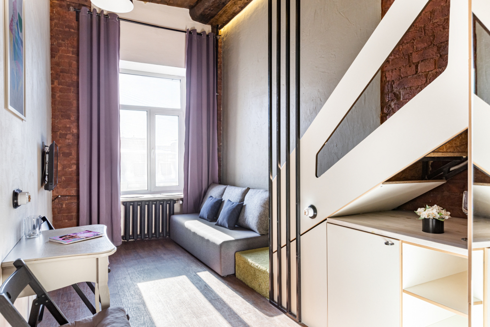 Студия площадью 21 м2. с 2 двуспальными кроватями 160*200 см. Вместимость номера - 4 гостя. Всего номеров этой категории - 1 шт.