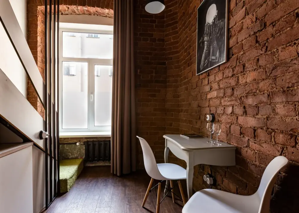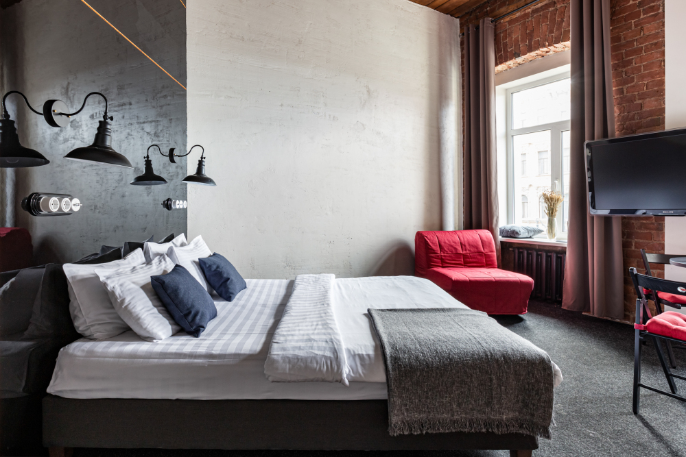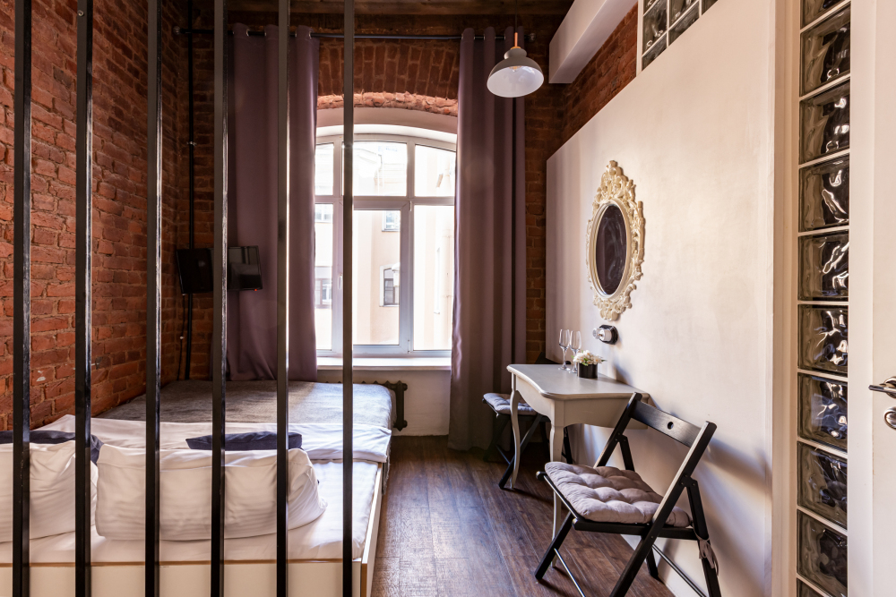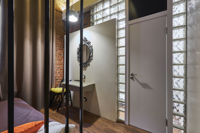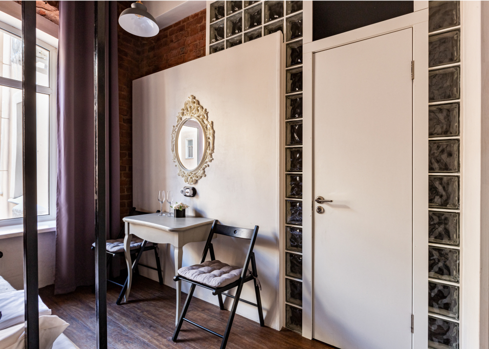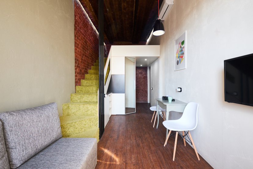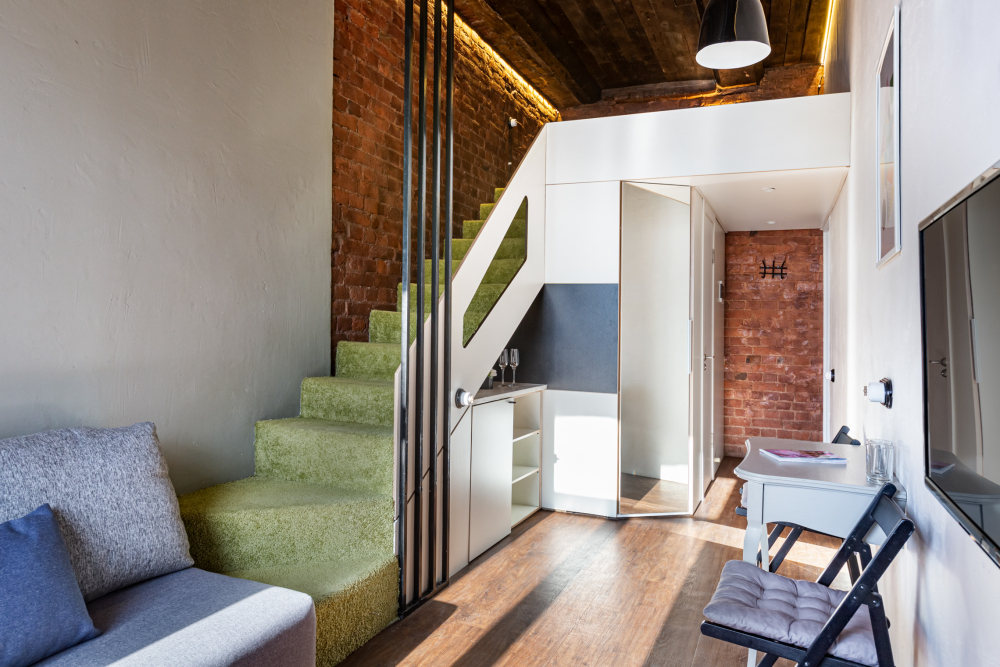 В номере: телевизор, холодильник, высокие потолки, гостиная зона, шкаф, вешалки, зеркало, письменный стол, стул, тапочки, светонепроницаемые шторы.