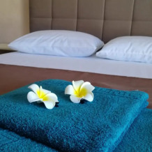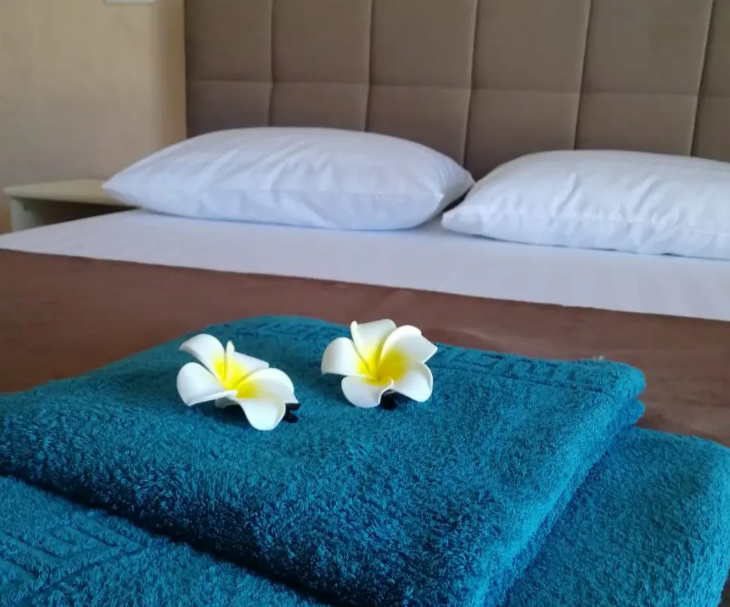 Во всех номерах есть кондиционеры, шкаф для одежды, холодильники, балконы с видом на море и во двор, собственная ванная комната и телевизор с плоским экраном. Предоставляется постельное белье и полотенца для номера и пляжа. Также есть апартаменты двухкомнатные со своей кухней. Завтрак включен в стоимость проживания.