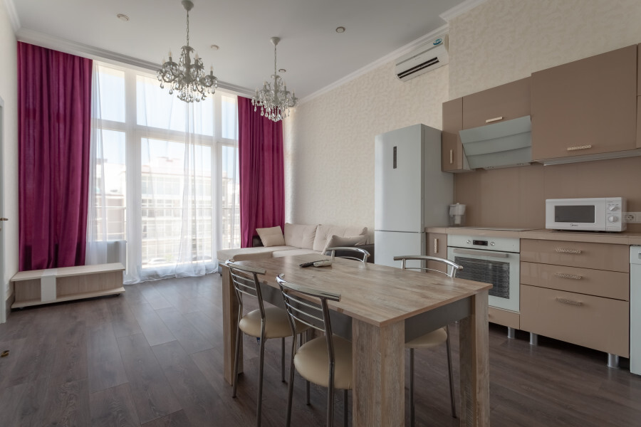 - Полностью оборудованная кухня: холодильник, микроволновая печь, плита, чайник, вытяжка и духовка.
