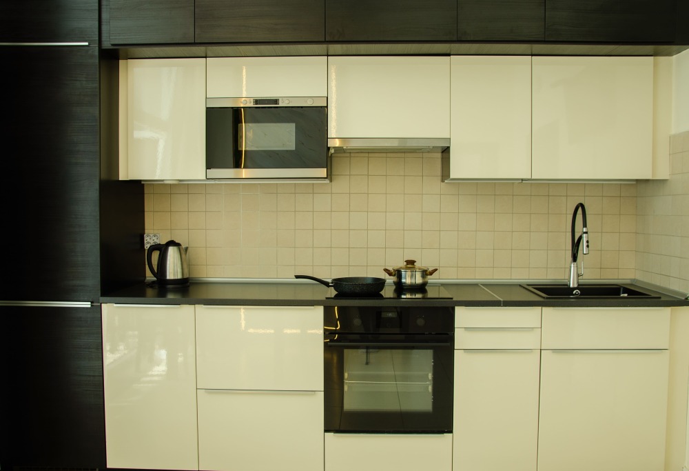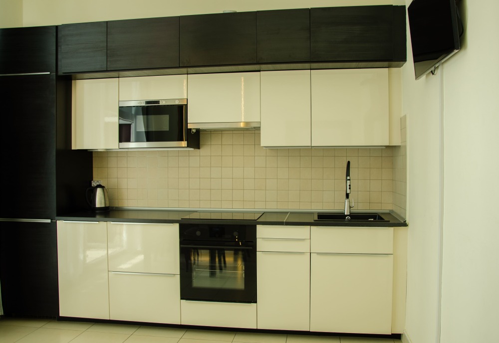 Полностью оборудованная кухня: холодильник, микроволновая печь, плита, чайник, вытяжка, духовка.
