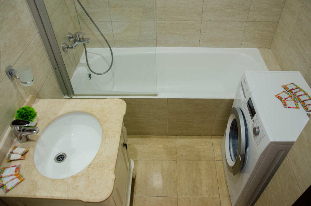Ванная комната с полотенцами, тапочками, феном, стиральной машиной и ванной.