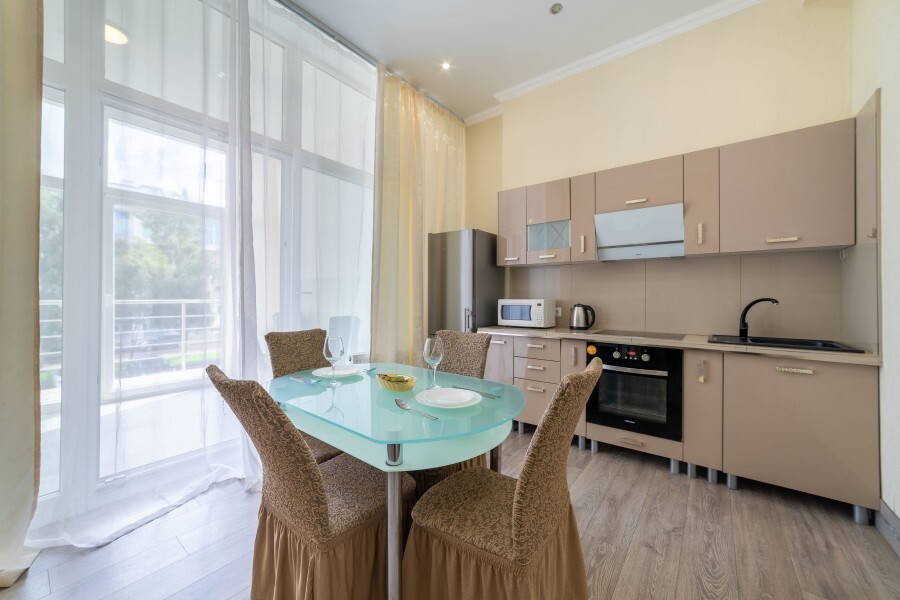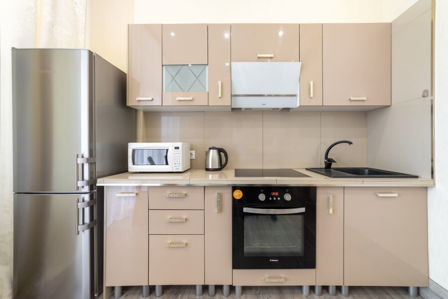 Кухня оборудована всем необходимым: холодильник, микроволновая печь, плита, чайник, вытяжка, духовка.