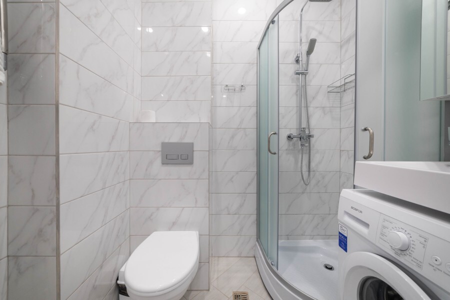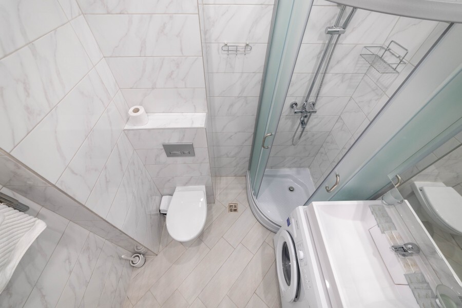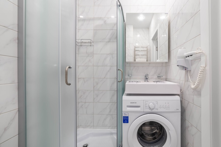 Удобная душевая комната со стиральной машинкой и феном.