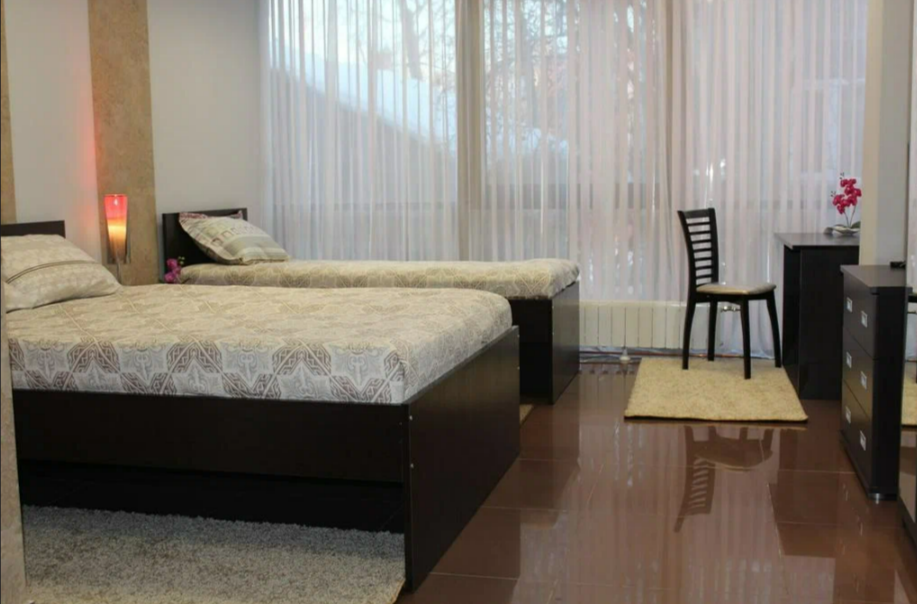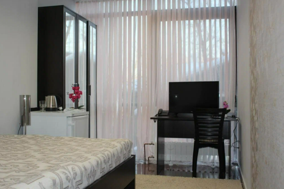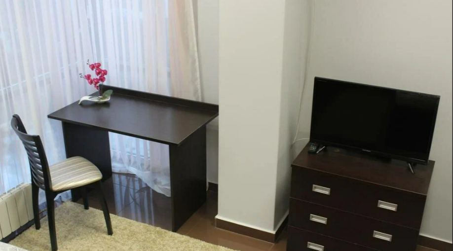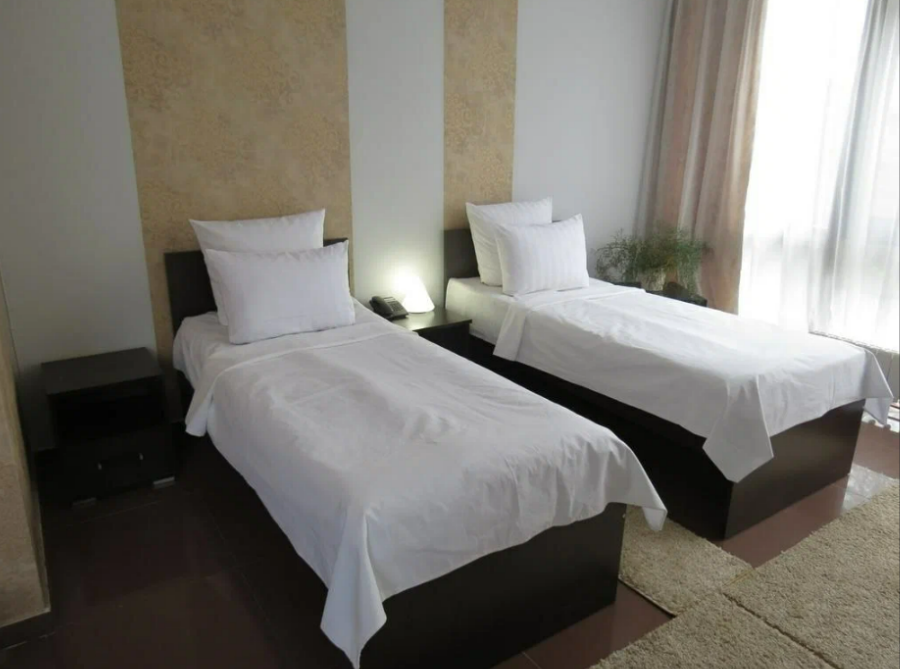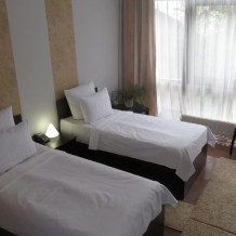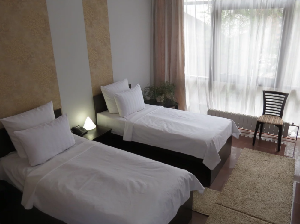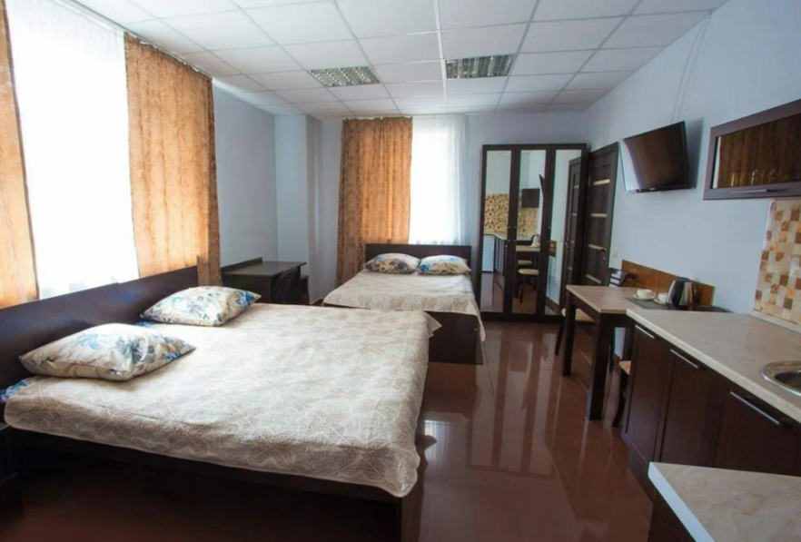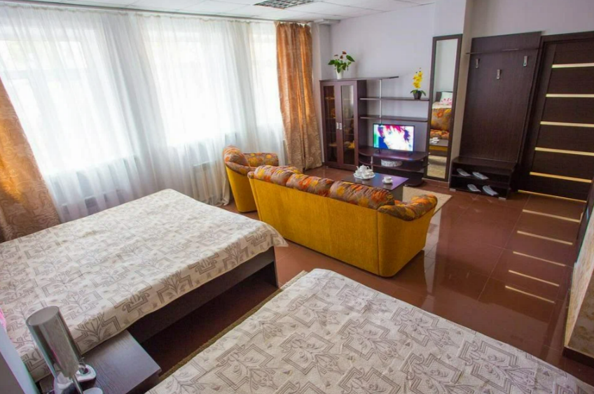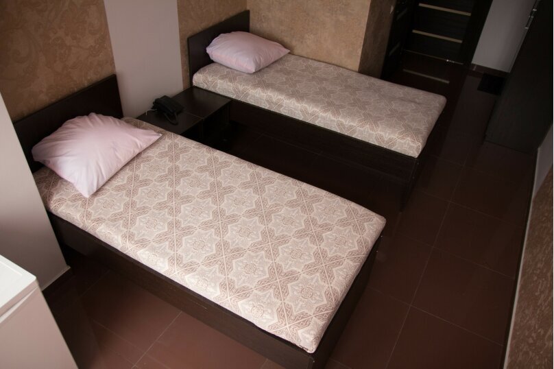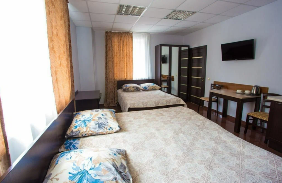 Для гостей есть все необходимое для комфортного отдыха: две кровати односпальные, коврик для ног, шкаф для одежды, зеркало в полный рост, стул, стол письменный, письменные принадлежности, телевизор, чайник электрический, кофейные чашки, чайный набор, прикроватные тумбы, светильник ночной, вешалки для одежды, фен, пакет для белья, удобства, гигиенические принадлежности (зубной набор, шапочка для душа, гель для душа, шампунь, мыло), полотенца, тапочки, постельное бельё, тумба для обуви, по запросу предоставляется посуда.