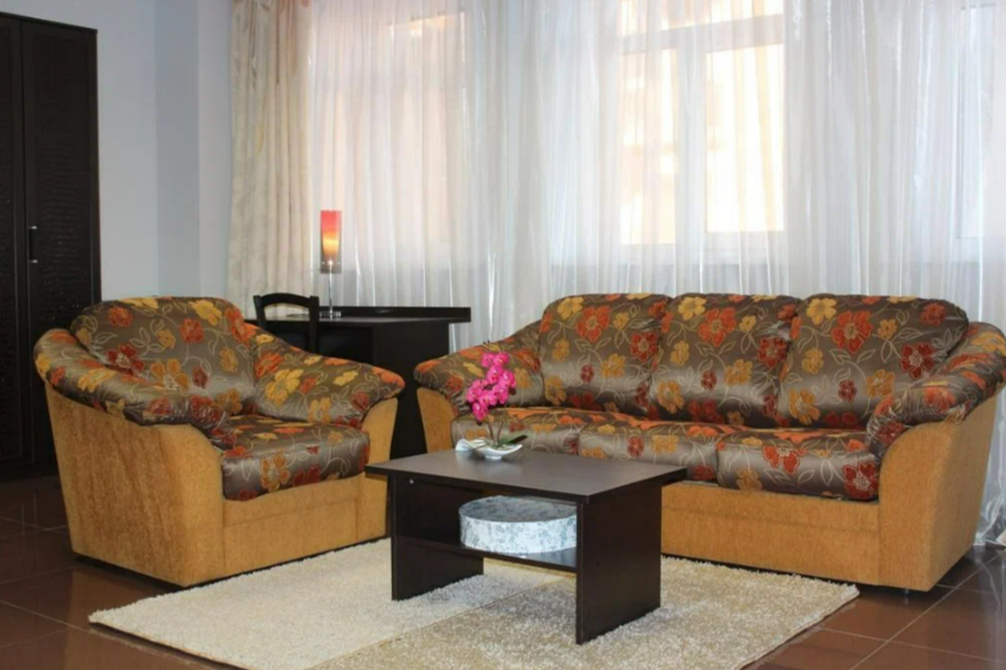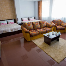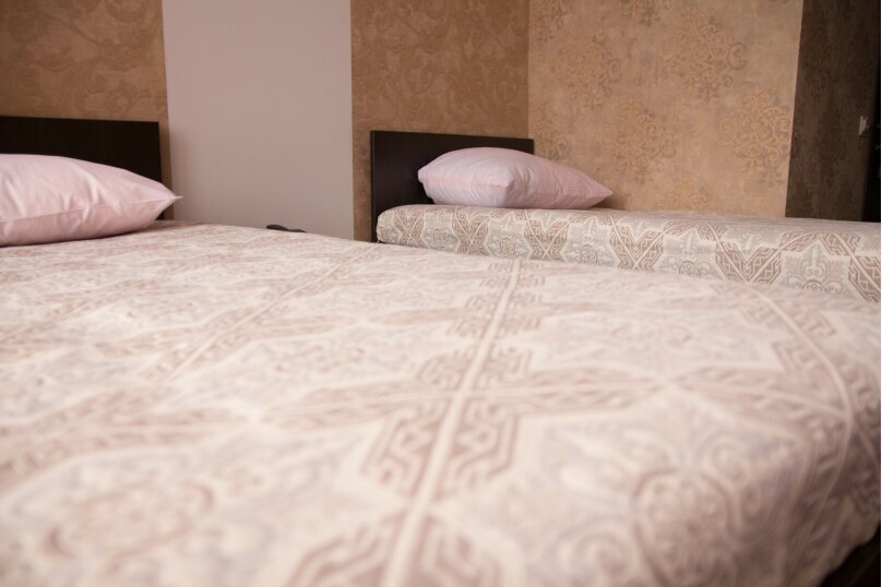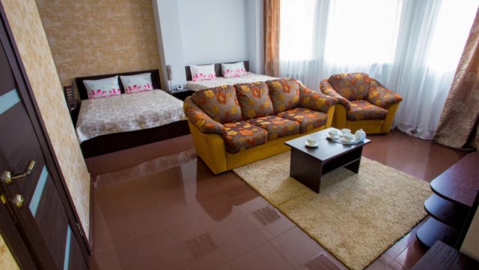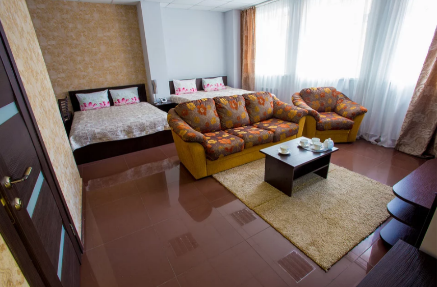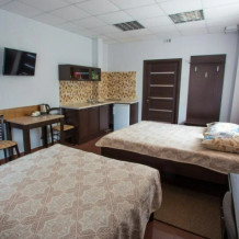Для гостей есть все необходимое для комфортного отдыха: две односпальные и двуспальная кровати, коврик для ног, шкаф для одежды, зеркало в полный рост, стул, стол письменный, письменные принадлежности, телевизор, чайник электрический, кофейные чашки, чайный набор, прикроватные тумбы, светильник ночной, вешалки для одежды, фен, пакет для белья, удобства, гигиенические принадлежности(зубной набор, шапочка для душа, гель для душа, шампунь, мыло), полотенца, тапочки, постельное бельё, тумба для обуви, по запросу предоставляется посуда.