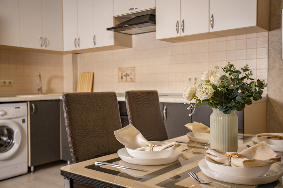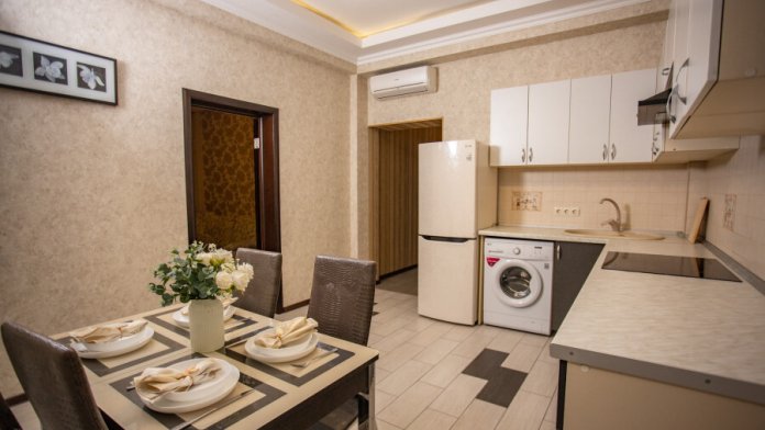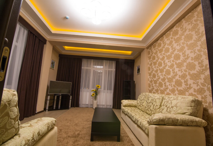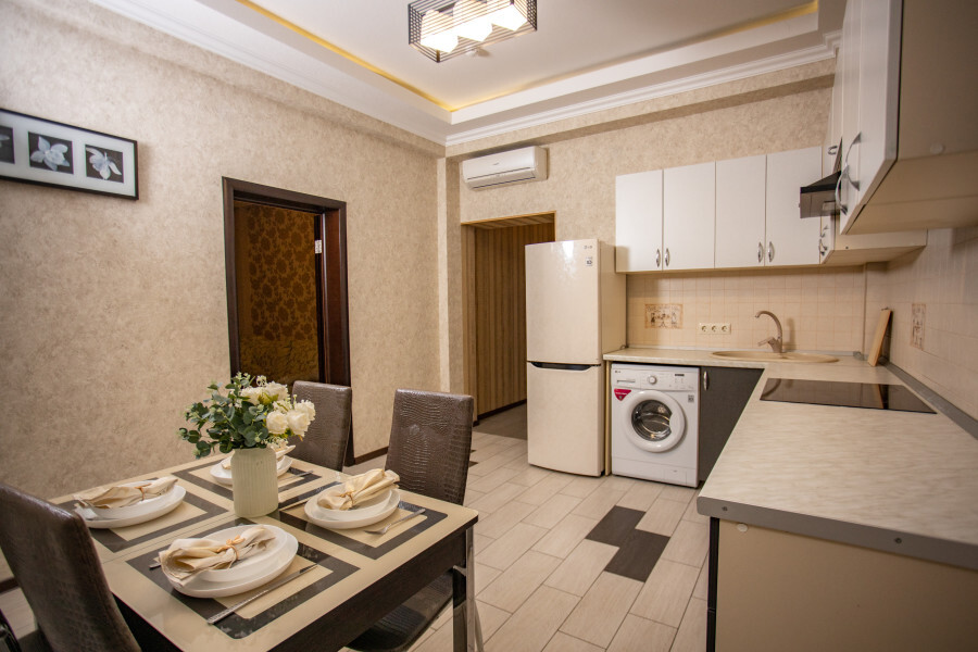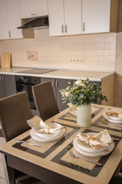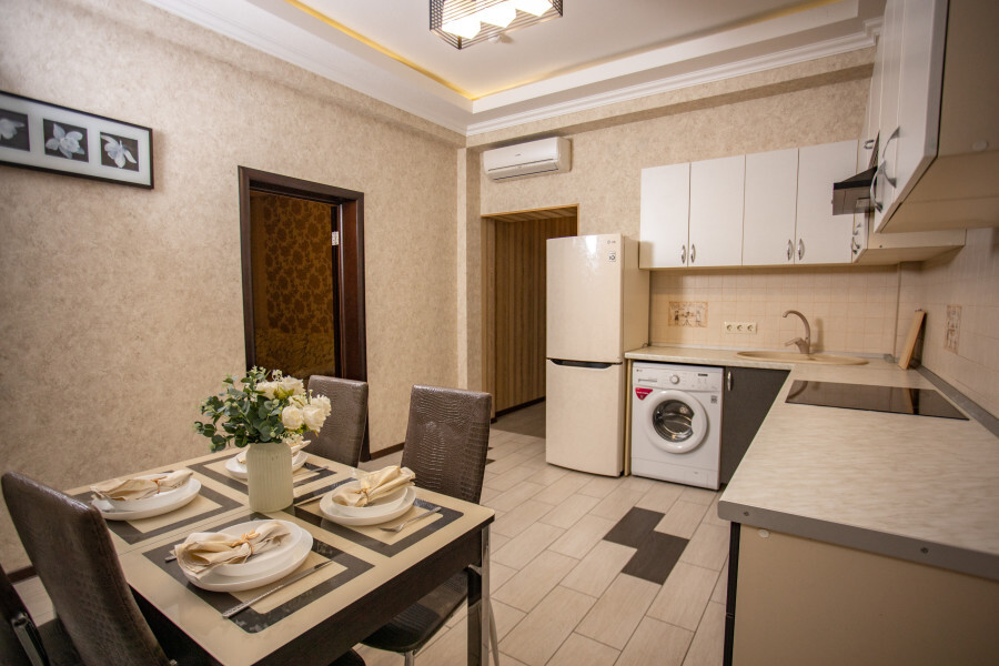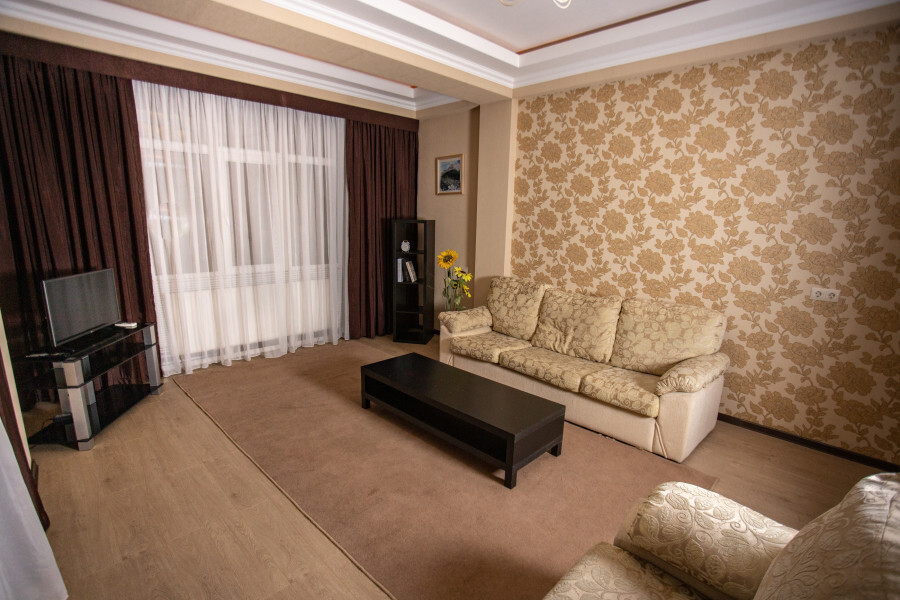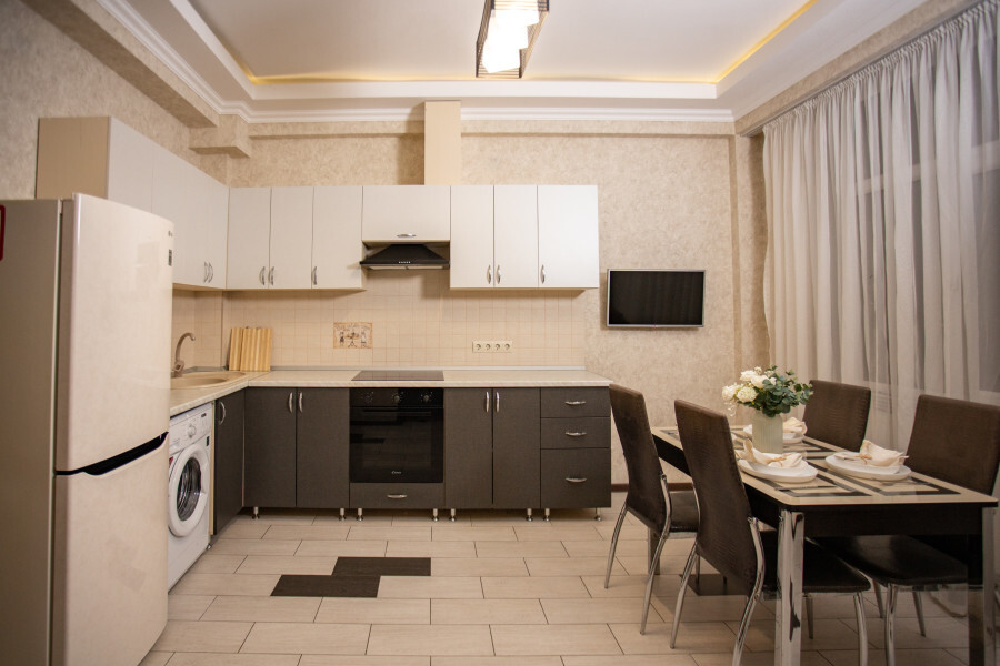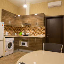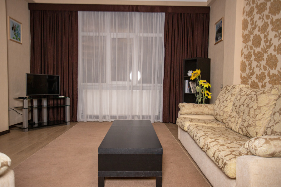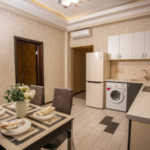 Во второй спальне диван и кресло-кровать. Апартаменты оснащены всеми современными удобствами, которые сделают Ваш отдых максимально комфортным: телевизор, спит-система, холодильник, фен, варочная панель, микроволновая печь, набор посуды для приготовления пищи, ванные принадлежности (гель для душа, мыло, шампунь).