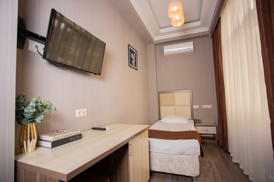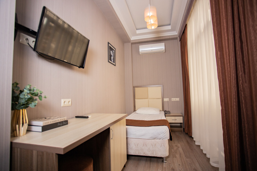 Одноместный номер вид во двор, площадью 15 кв.м., в котором установлена одна односпальная кровать.