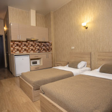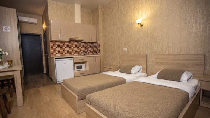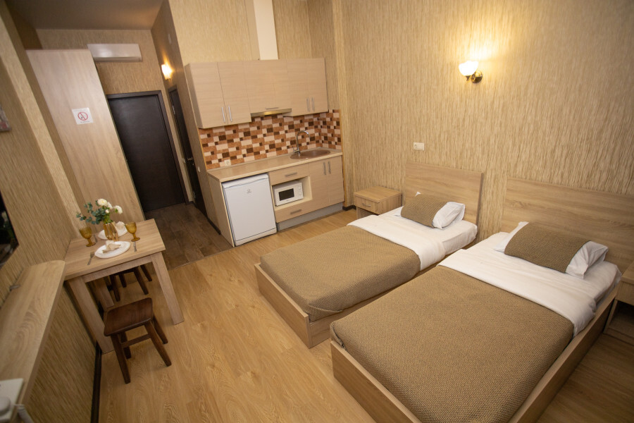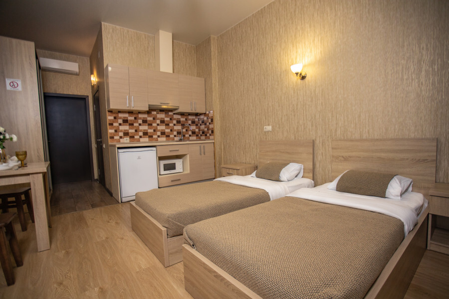 Апартаменты-студия с кухней, площадью 23 кв.м., в которых установлены две односпальных кровати.