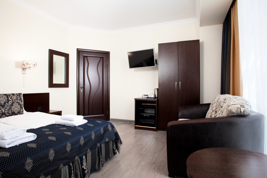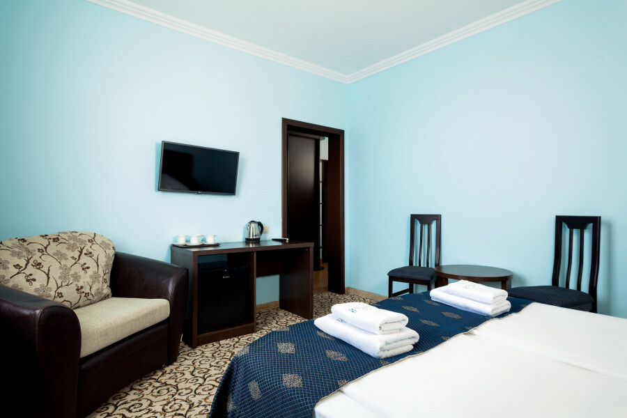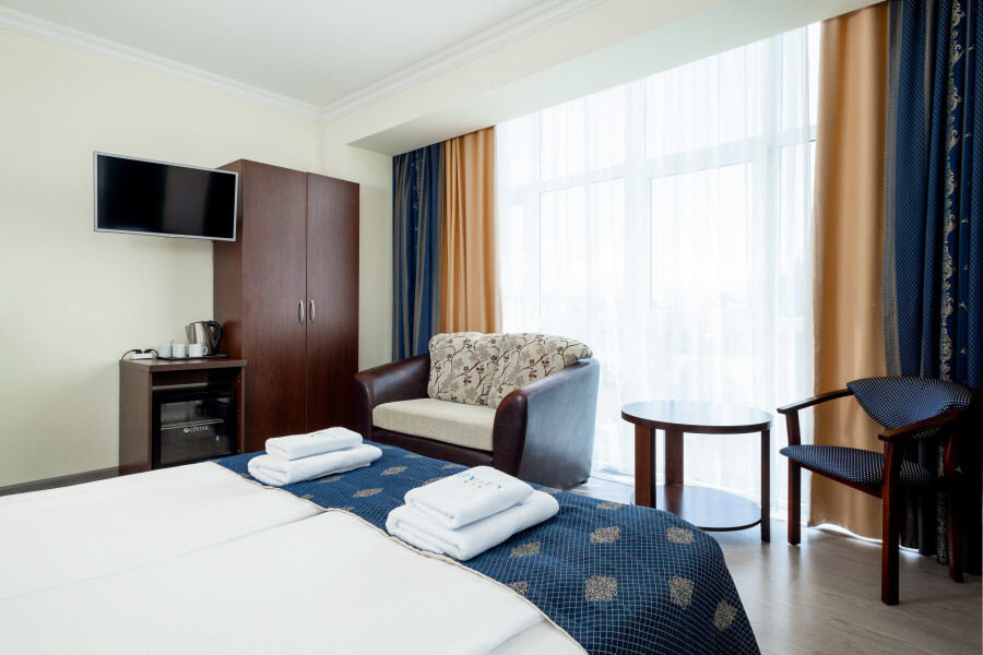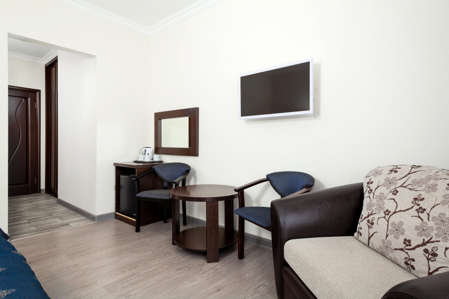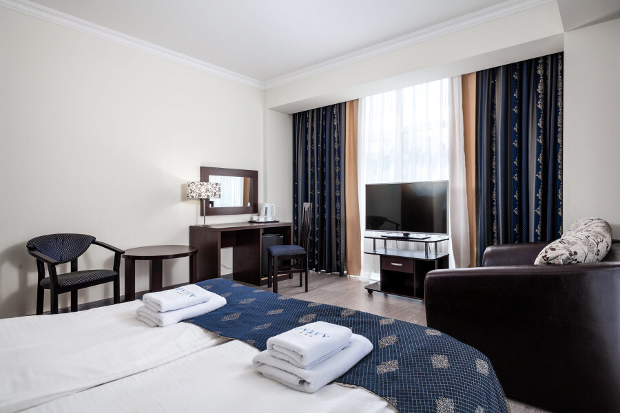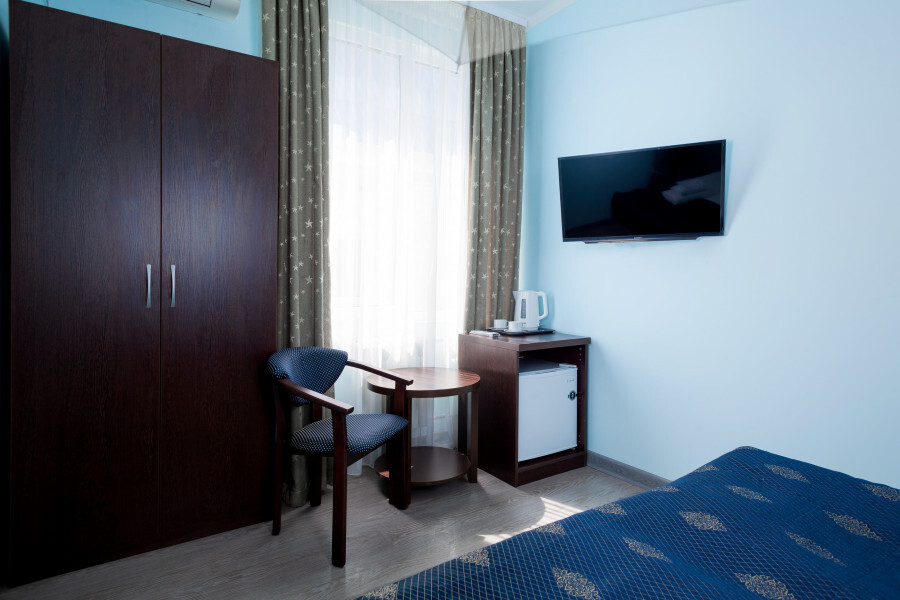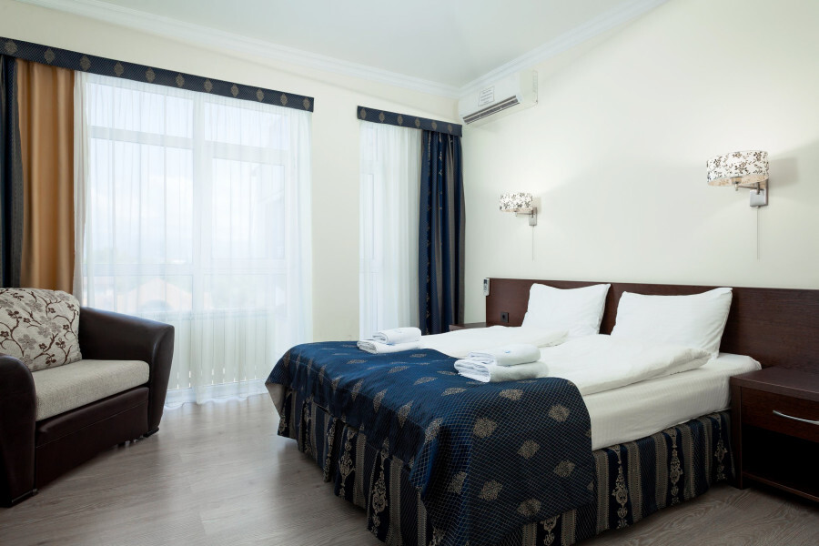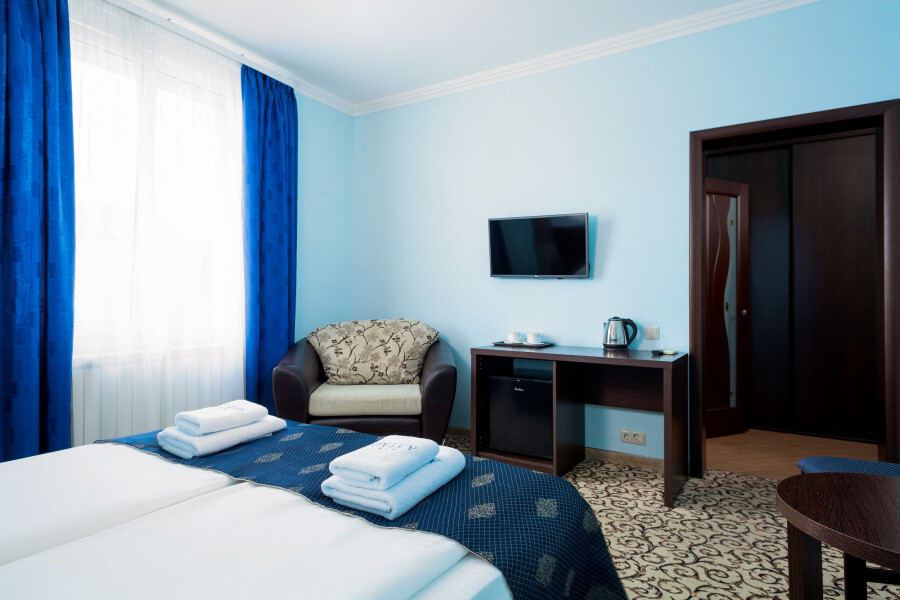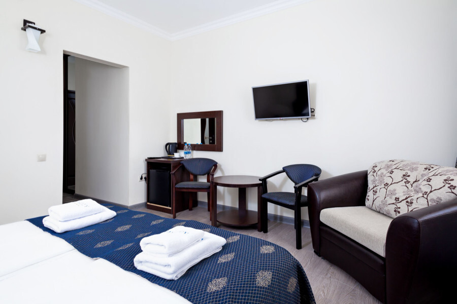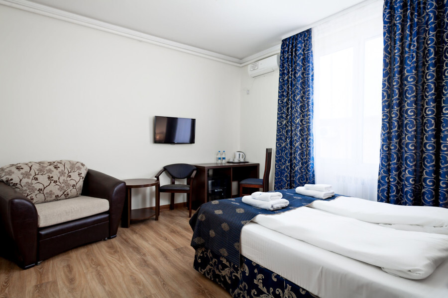 В номере расположена 2-спальная кровать (по запросу разделяем на две односпальные кровати), раскладное кресло, имеется душ, туалет. Номер для комфортного проживания оснащен сплит-системой, имеется телевизор, холодильник, шкаф для хранения вещей.