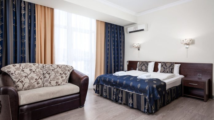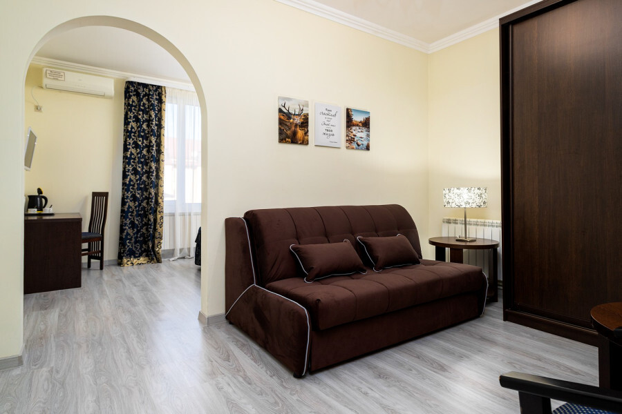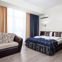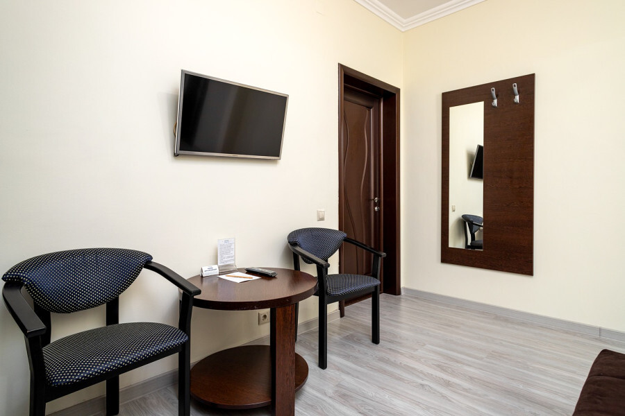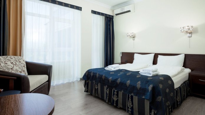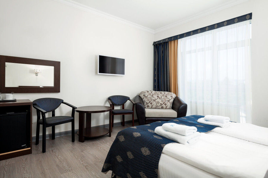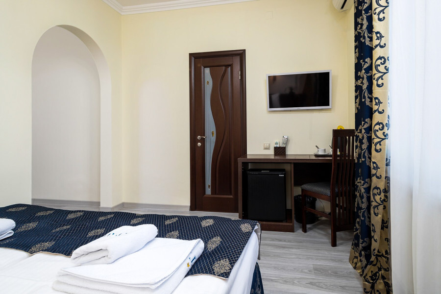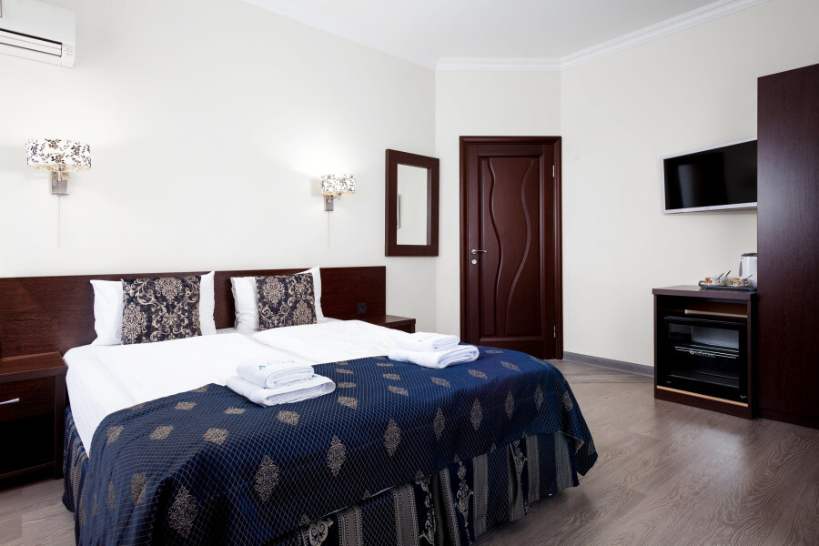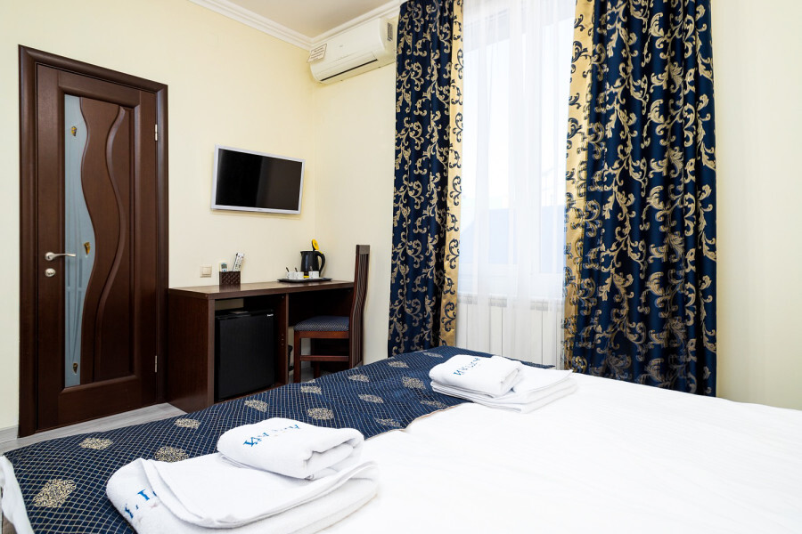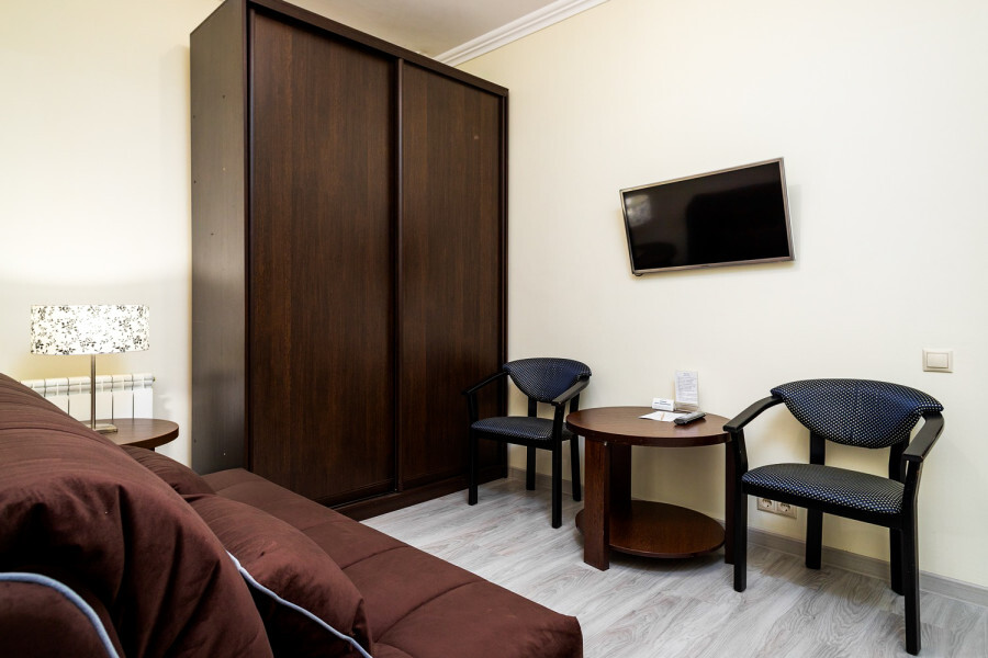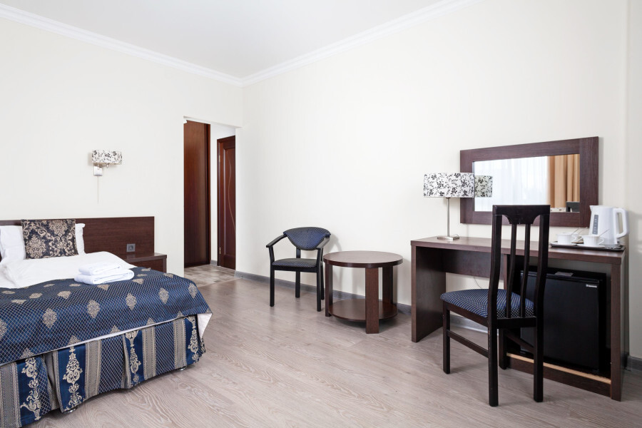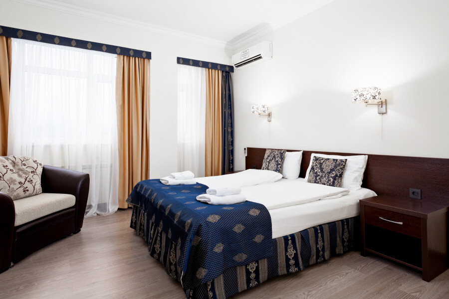 В номере расположена 2-спальная кровать (по запросу разделяем на две односпальные кровати), раскладное кресло, имеется душ, туалет. Номер для комфортного проживания оснащен сплит-системой, имеется телевизор, холодильник, шкаф для хранения вещей.