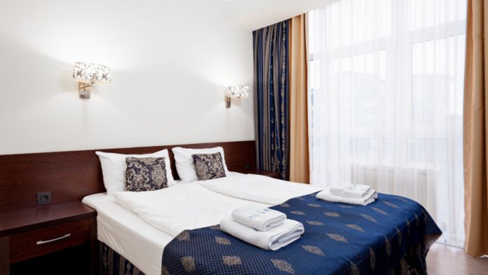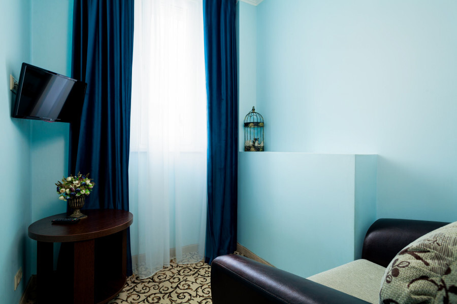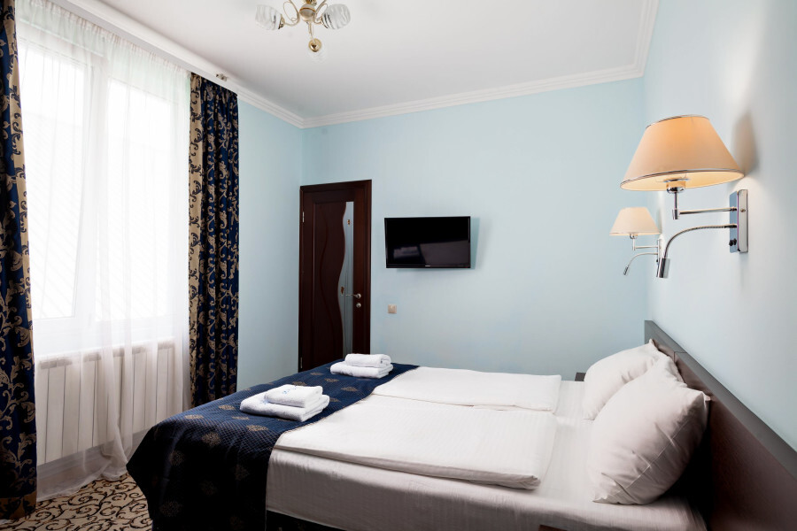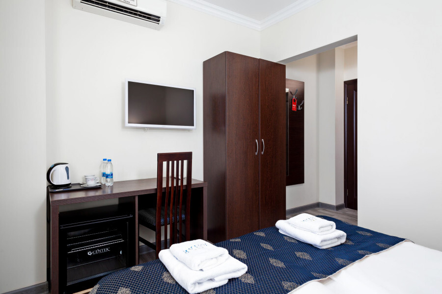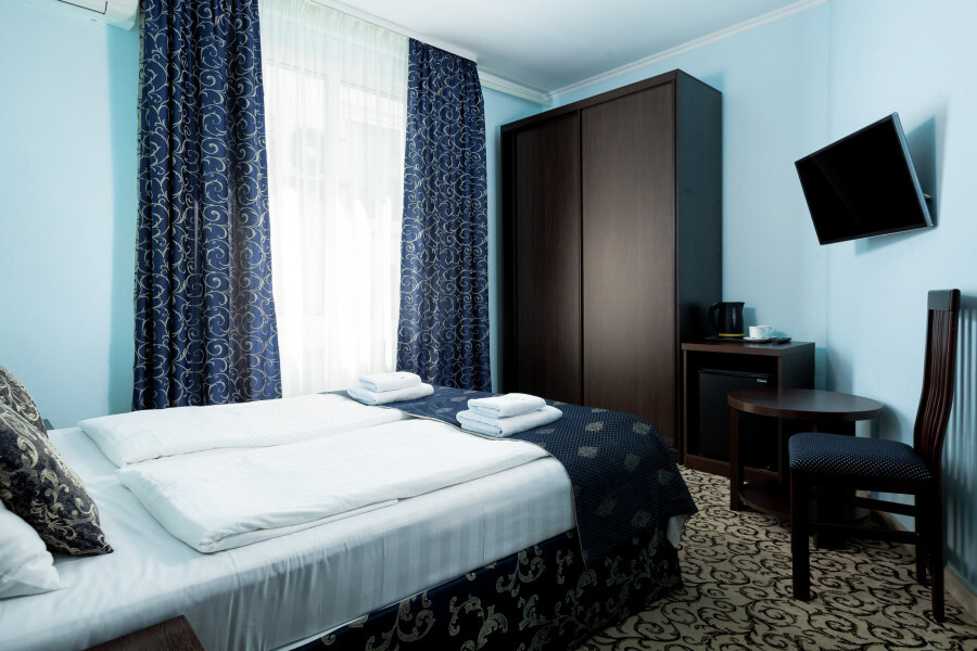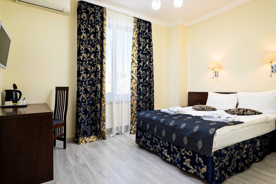 Небольшой двухместный номер с 1 кроватью размером 140*200, находится на 3 этаже отеля, к сожалению не имеет вида, так как рядом стена соседнего дома, зато тихо и уютно.