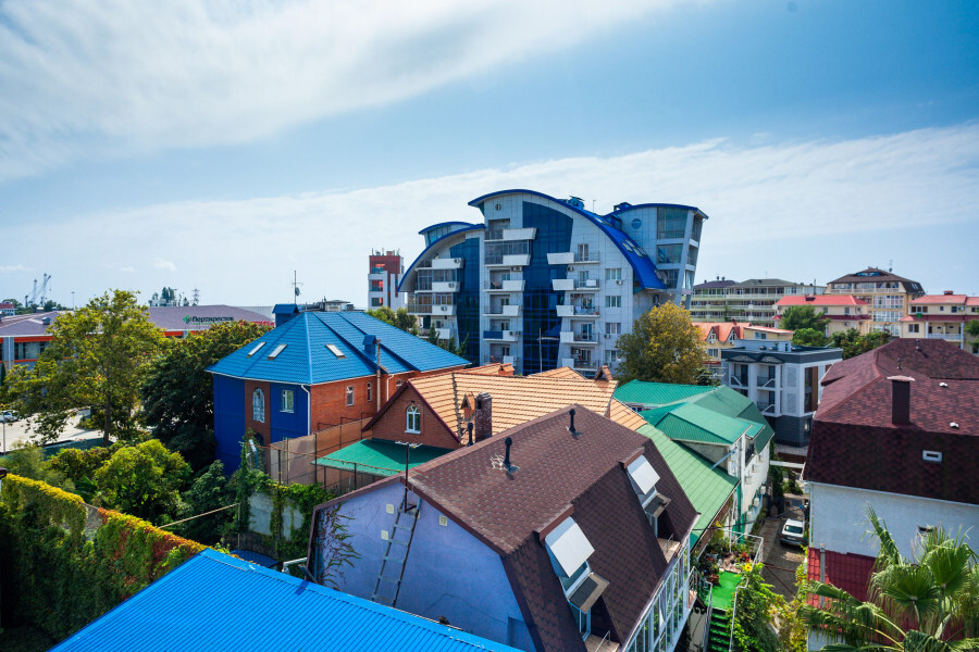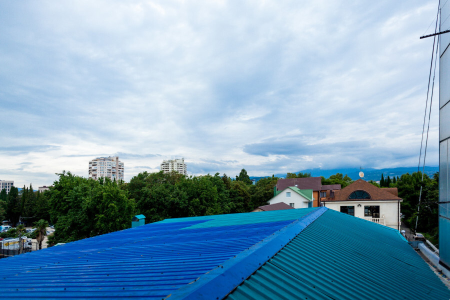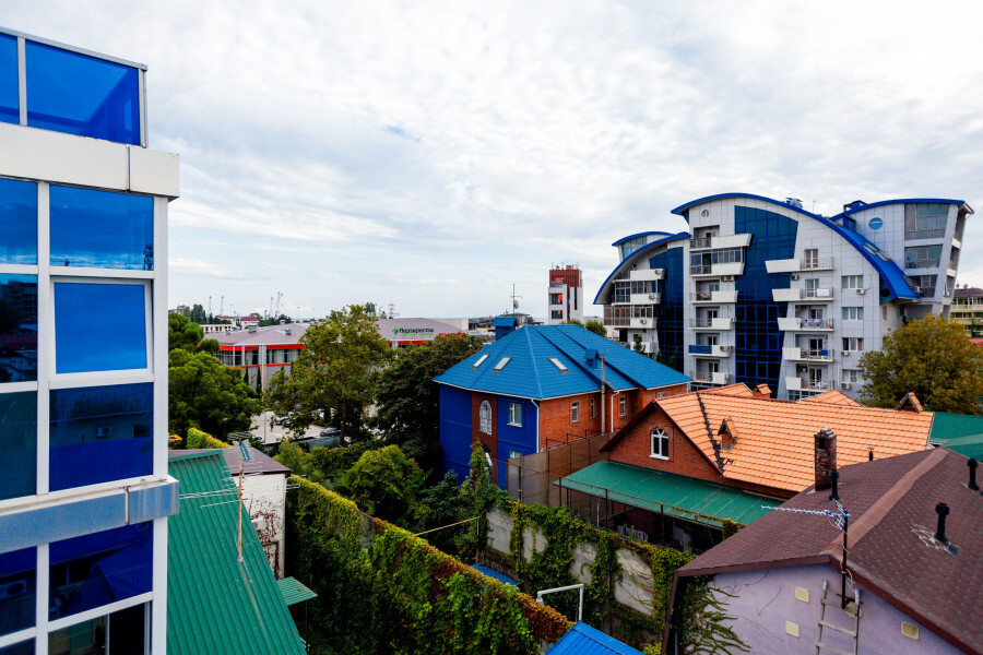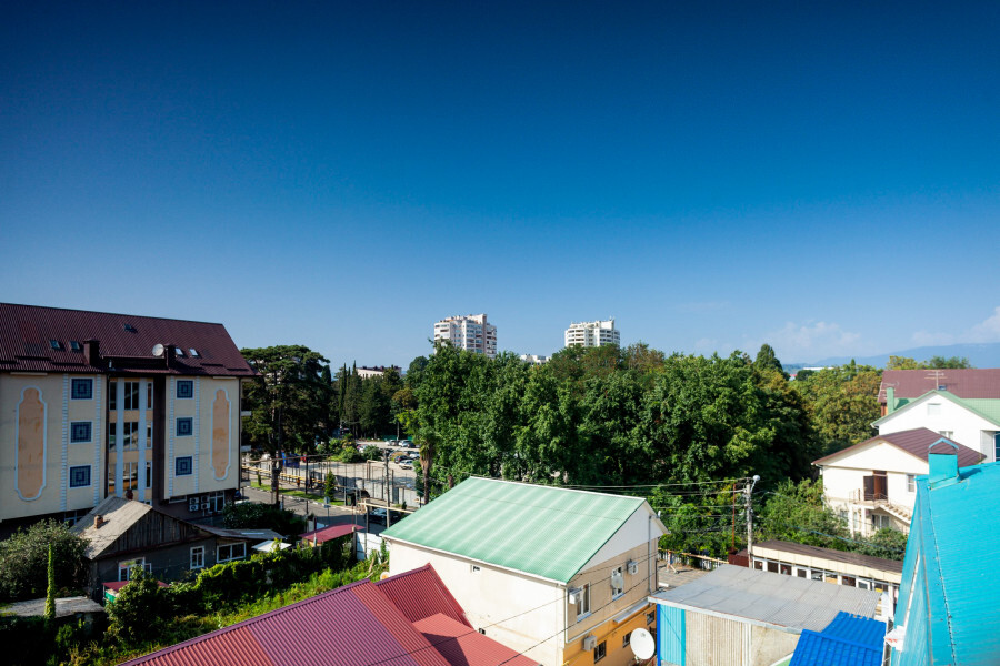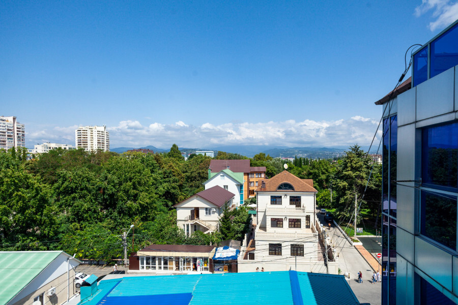 В номере большая спальня с панорамными окнами, с большой двуспальной кроватью (по запросу разделяем на две односпальные кровати), большое раскладное кресло, имеется душевая кабина, туалет. Красивый вид из 2 панорамных окон на город, набережную реки Мзымта и горы.