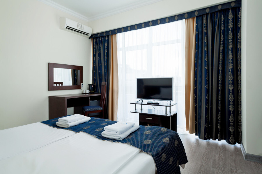 В номере большая спальня с большой двуспальной кроватью (по запросу разделяем на две односпальные кровати), большое раскладное кресло, имеется душевая кабина, туалет. Вид из окна на город, горы (не солнечная сторона).