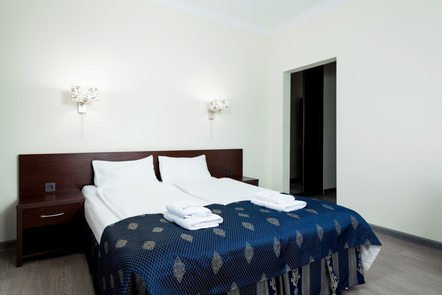 В номере большая спальня с большой двуспальной кроватью (по запросу разделяем на две односпальные кровати), большое раскладное кресло, имеется душевая кабина, туалет. Красивый вид из окна на горы (не солнечная сторона).
