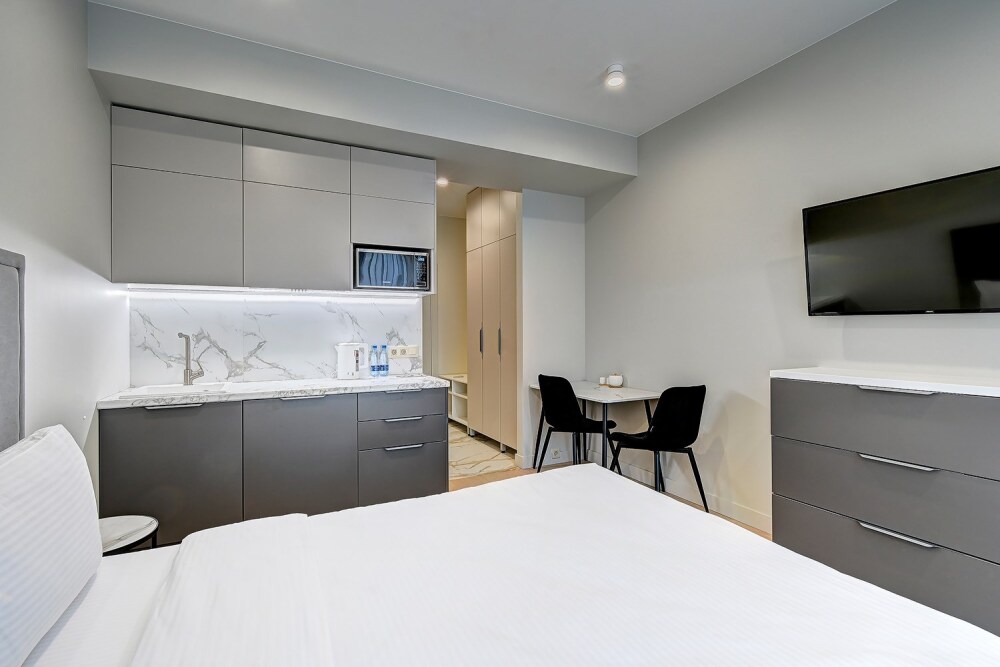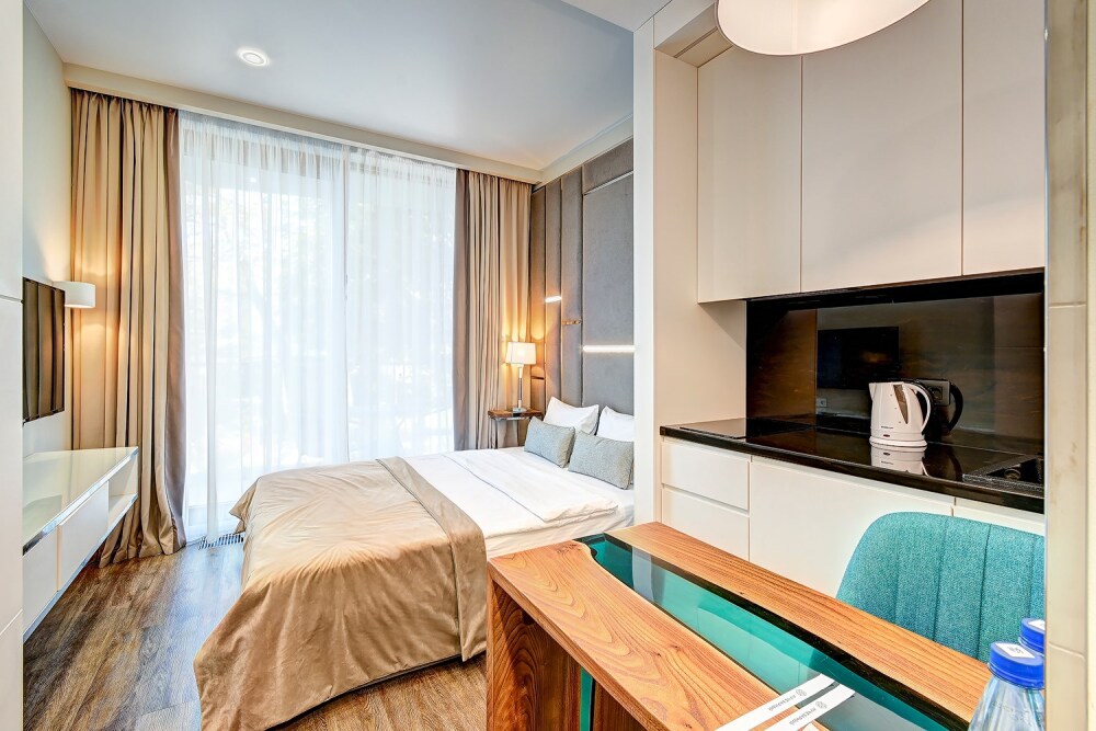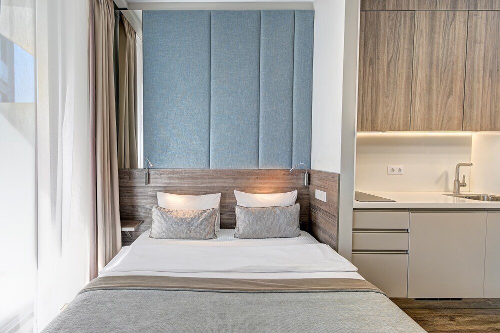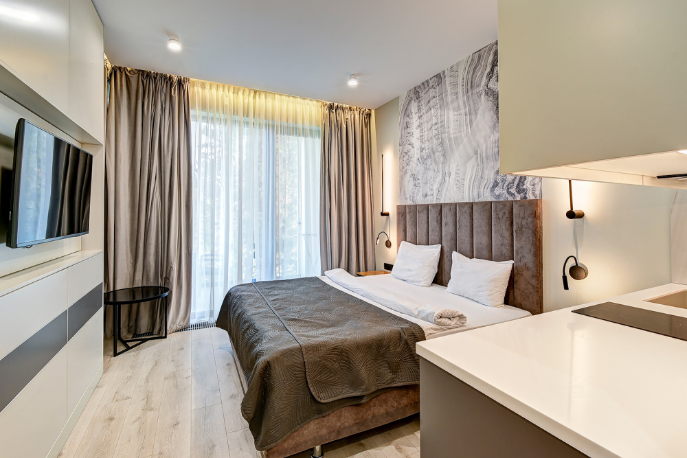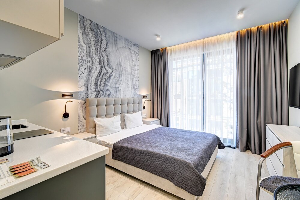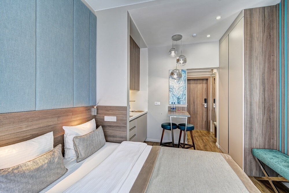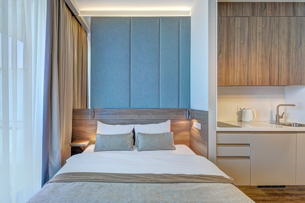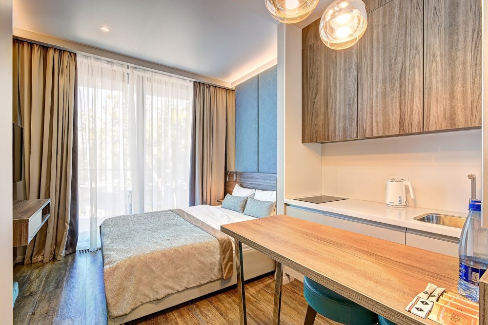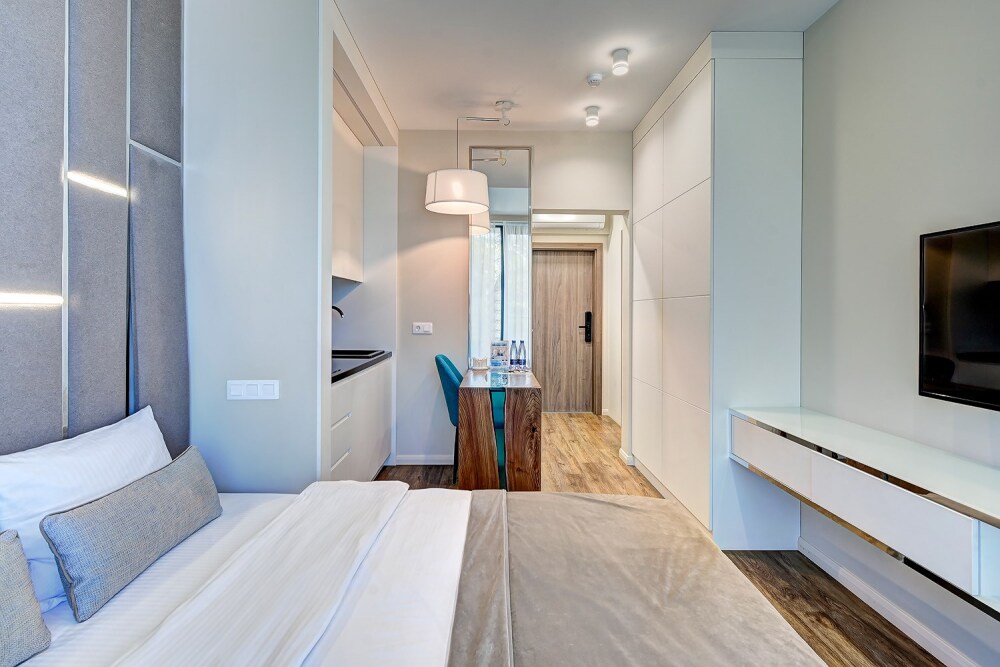 Широкий выбор апартаментов различного размера и конфигурации, чтобы соответствовать потребностям различных клиентов, будь то семьи, пары или деловые путешественники. От студий стандарт до номеров «Grand Luxe». Только высокое качество номеров с современным дизайном, удобствами и полным набором необходимых удобств для комфортного проживания. Полностью оборудованная мини-кухня, мягкая мебель из велюра, система кондиционирования и встроенного отопления, LCD-телевизор с цифровыми каналами и радио, фен, окна и двери с повышенной звукоизоляцией, высокоскоростной Wi-Fi, косметический набор.