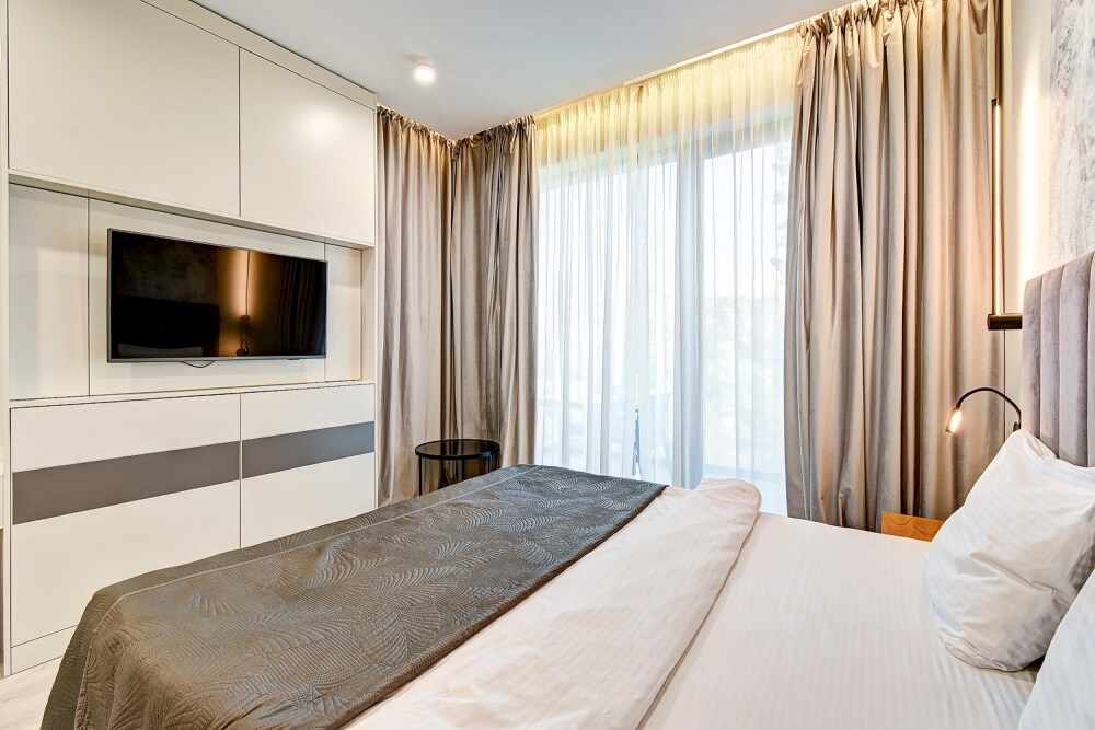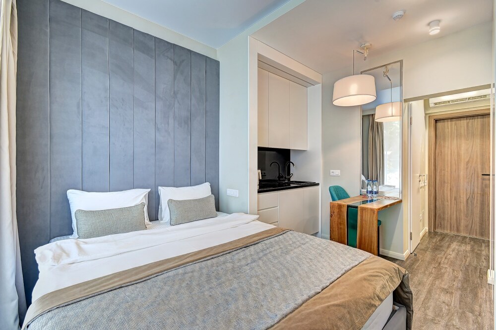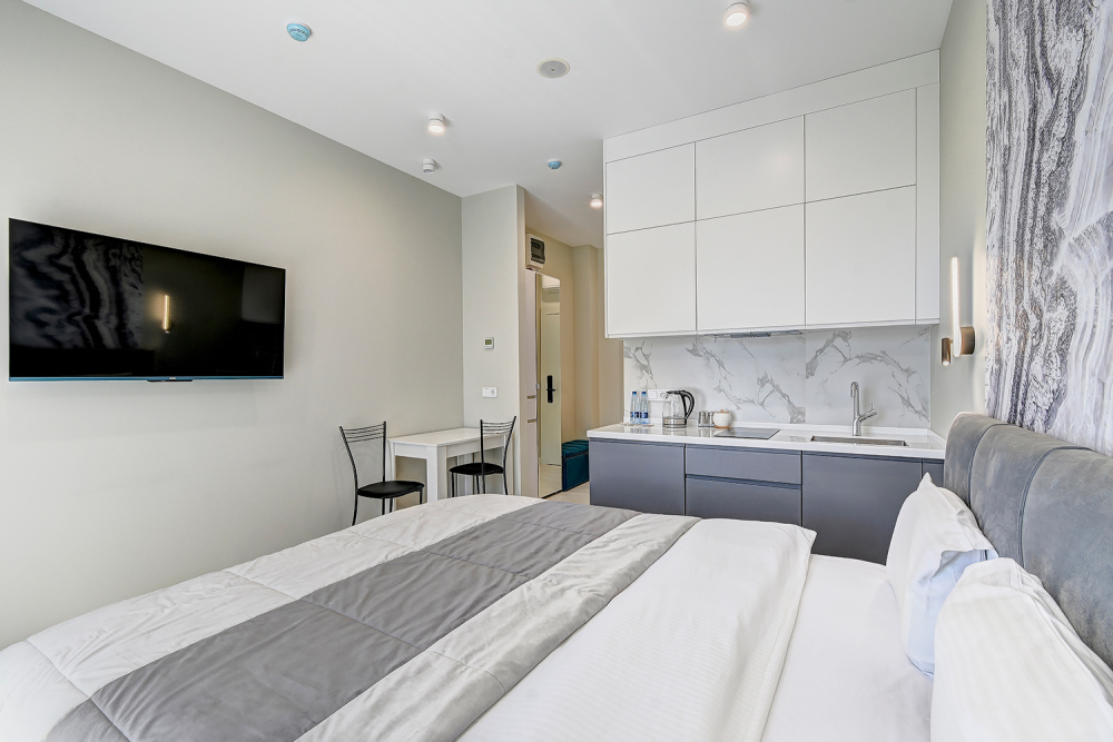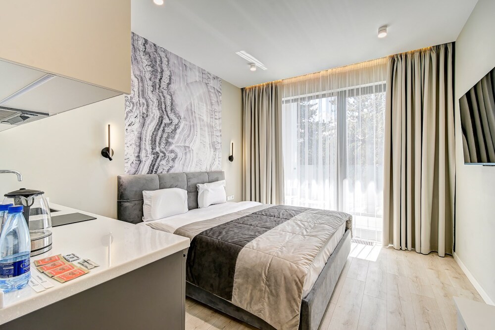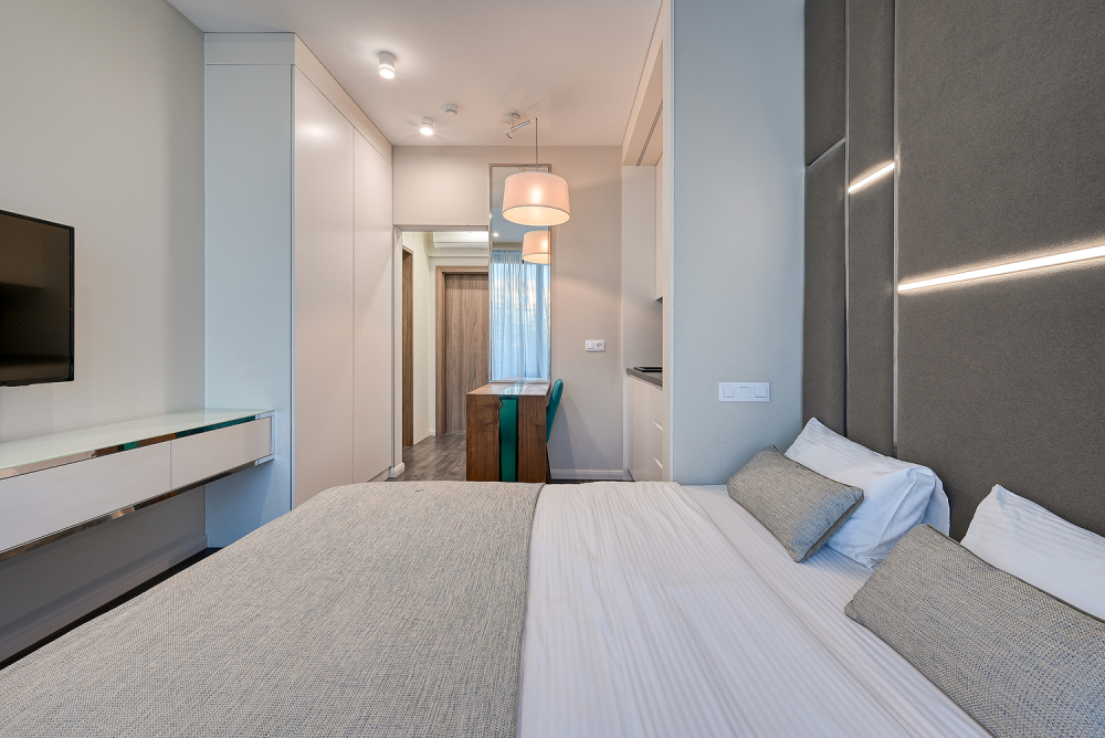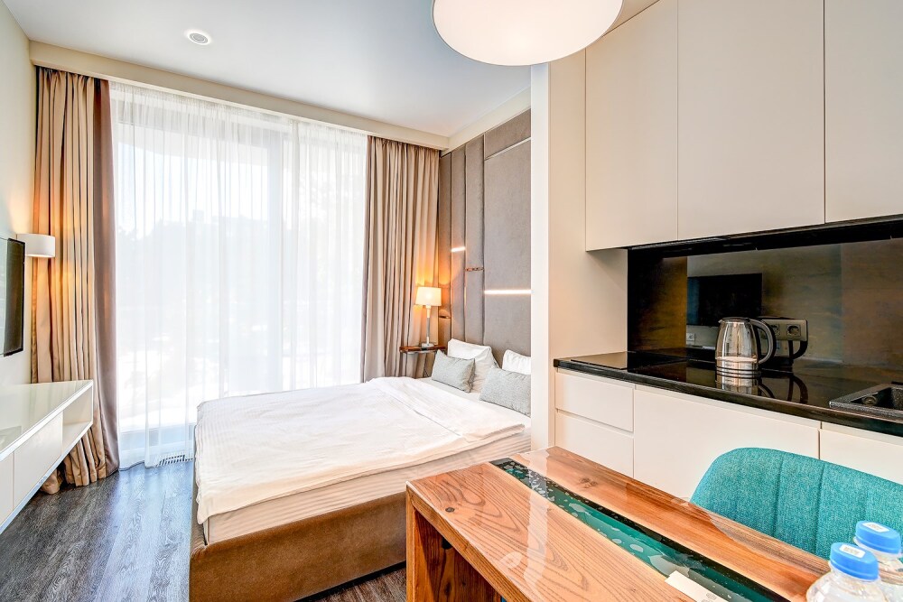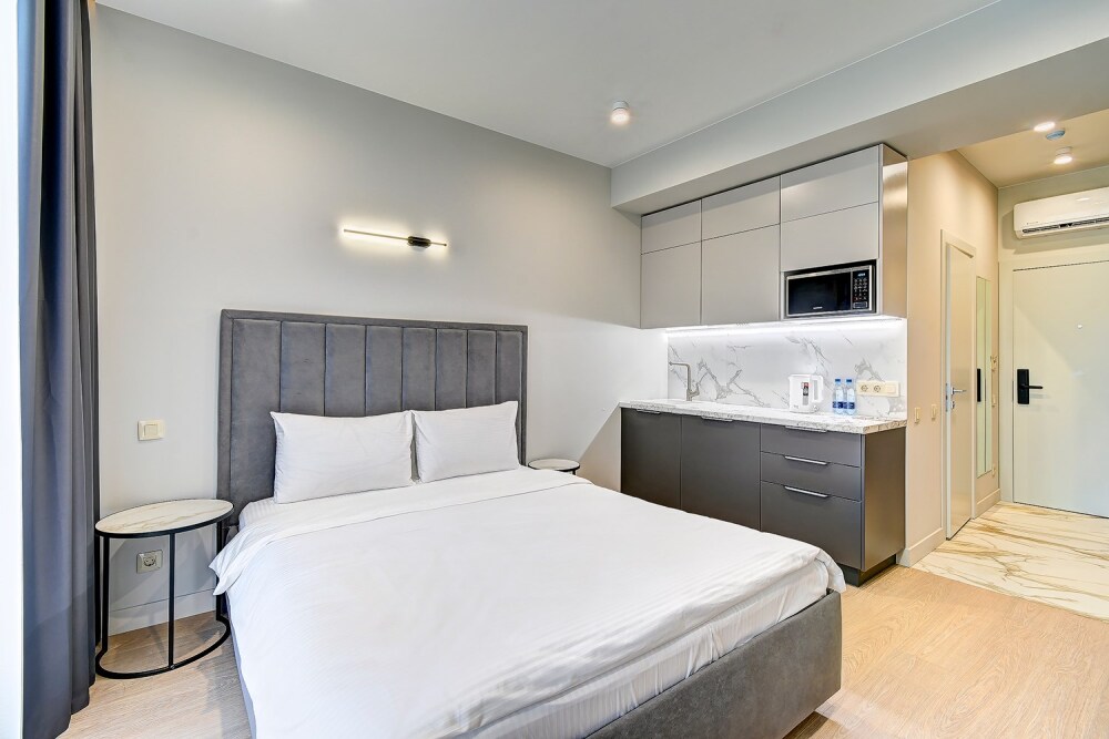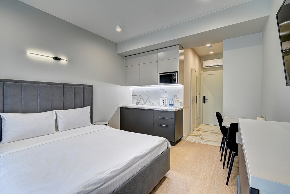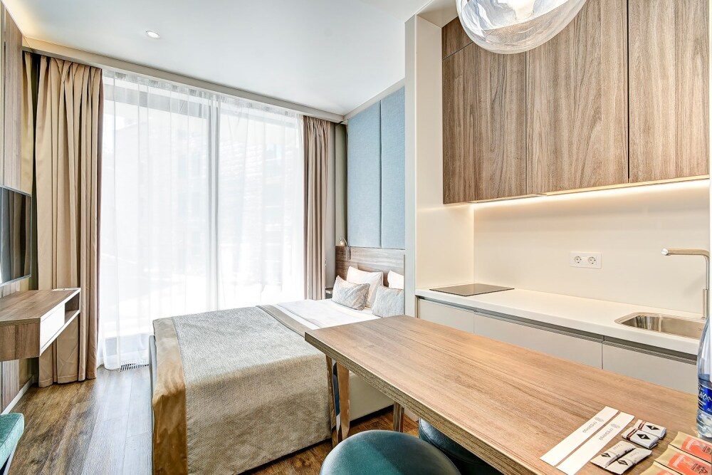 Широкий выбор апартаментов различного размера и конфигурации, чтобы соответствовать потребностям различных клиентов, будь то семьи, пары или деловые путешественники. От студий стандарт до номеров «Grand Luxe». Только высокое качество номеров с современным дизайном, удобствами и полным набором необходимых удобств для комфортного проживания. Полностью оборудованная мини-кухня, мягкая мебель из велюра, система кондиционирования и встроенного отопления, LCD-телевизор с цифровыми каналами и радио, фен, окна и двери с повышенной звукоизоляцией, высокоскоростной Wi-Fi, косметический набор.